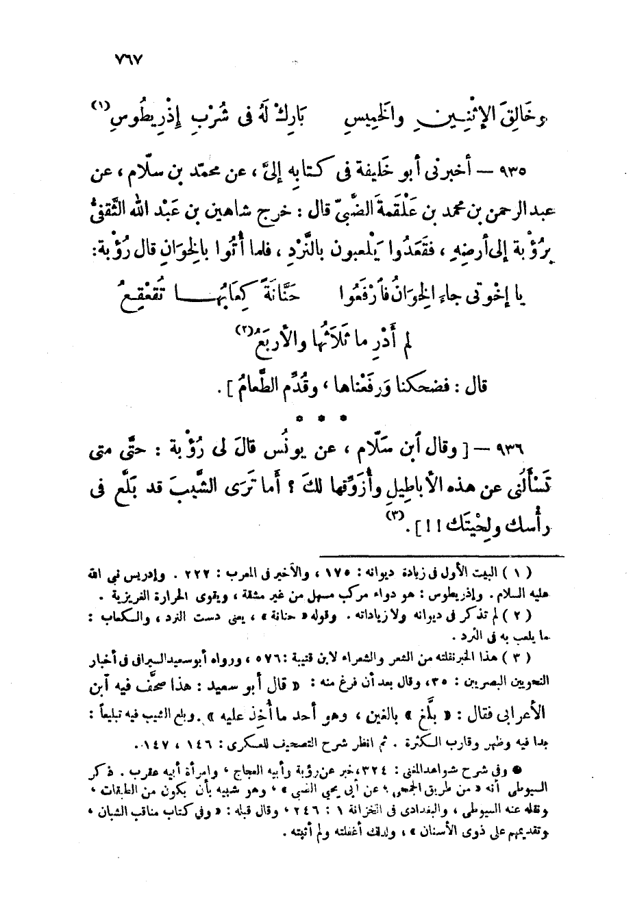 936 - وَقَالَ ابْن سَلام عَن يُونُس قَالَ لى رؤبة حَتَّى مَتى تسألنى عَن هَذِه الأباطيل وأزوقها لَك أما ترى الشيب قد بلع فى رَأسك ولحيتك