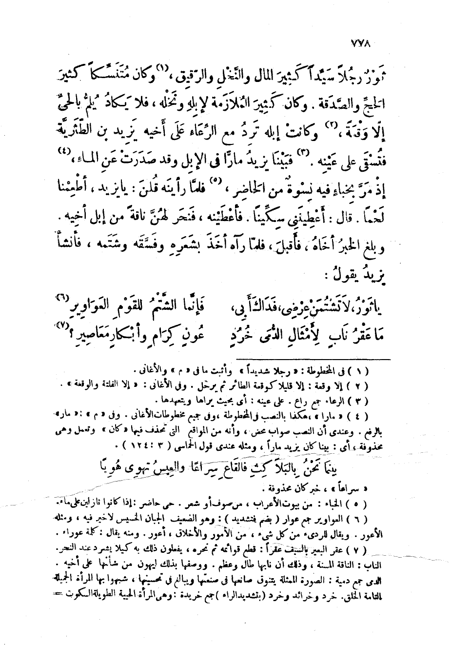 ثَوْر رجلا سيدا كثير المَال وَالنَّخْل وَالرَّقِيق وَكَانَ متنسكا كثير الْحَج وَالصَّدَََقَة وَكَانَ كثير الْمُلَازمَة لإبله ونخله فَلَا يكَاد يلم بالحى إِلَّا وقْعَة وَكَانَت إبِله ترد مَعَ الرعاء على أَخِيه يزِيد بن الطثرية فتسقى على عينه فَبينا يزِيد مارا فى الْإِبِل وَقد صدرت عَن المَاء إِذْ مر بخباء فِيهِ نسْوَة من الْحَاضِر فَلَمَّا رأينه قُلْنَ يَا يزِيد أطعمنَا لَحْمًا قَالَ اعطينني سكينا فأعطينه فَنحر لَهُنَّ نَاقَة من إبل أَخِيه وَبلغ الْخَبَر أَخَاهُ فَأقبل فَلَمَّا رَآهُ أَخذ بِشعرِهِ وفسقه وَشَتمه فَأَنْشَأَ يزِيد يَقُول