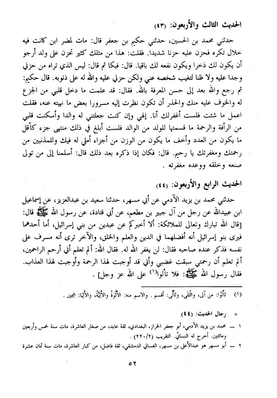43 - حَدَّثَنِي مُحَمَّدُ بْنُ الْحُسَيْنِ، حَدَّثَنِي حَكِيمُ بْنُ جَعْفَرٍ، قَالَ: " §مَاتَ لِمُضَرَ ابْنٌ كَانَتْ فِيهِ خِلَالٌ تُكْرَهُ فَحَزِنَ عَلَيْهِ حُزْنًا شَدِيدًا فَقُلْتُ: هَذَا مِنْ مِثْلكَ كَثِيرٌ تَحْزَنُ عَلَى وَلَدٍ أَرْجُو أَنْ يَكُونَ لَكَ ذُخْرًا وَيَكُونُ نَفْعُهُ لَكَ بَاقِيًا قَالَ: فَبَكَا، ثُمَّ قَالَ: لَيْسَ الَّذِي تَرَاهُ مِنْ حُزْنِي وَجْدًا عَلَيْهِ وَلَا ظَنًّا لِتَغَيُّبِ شَخْصِهِ عَنِّي؛ وَلَكِنْ حُزْنِي عَلَيْهِ وَاللَّهِ لَهُ عَلَى ذُنُوبِهِ، قَالَ حَكِيمٌ: ثُمَّ رَجَعَ وَاللَّهِ بَعْدُ إِلَى حُسْنِ الْمَعْرِفَةِ بِاللَّهِ فَقَالَ: قَدْ عَلِمْتُ مَا دَخَلَ قَلْبِي مِنَ الْجَزَعِ لَهُ وَالْخَوْفِ عَلَيْهِ مِنْكَ وَالْحَذَرِ أَنْ تَكُونَ نَظَرْتَ إِلَيْهِ مَسْرُورًا بَعْضَ مَا نَهَيْتَهُ عَنْهُ فَقُلْتُ: اعْمَلْ مَا شِئْتَ فَلَسْتُ أَغْفِرُ لَكَ أَنَا. إِلَهِي، وَإِنَّ كُنْتَ جَعَلْتَنِي لَهُ وَالِدًا وَأَسْكَنْتَ قَلْبِي مِنَ الرَّأْفَةِ وَالرَّحْمَةِ مَا قَسَمْتَهَا لِلْوَلَدِ مِنَ الْوَالِدِ فَلَسْتُ أَبْلُغُ فِي ذَلِكَ مُنْتَهَى جُزْءٍ كَأَقَلِّ مَا يَكُونُ مِنَ الْعَدَدِ وَأَخَفُّ مَا يَكُونُ مِنَ الْوَزْنِ مِنْ أَجْزَاءٍ أَمَلِي لَهُ فِيكَ وَلِلْمُذْنِبِينَ مِنْ رَحْمَتِكَ وَمَغْفِرَتِكَ يَا رَحِيمُ، قَالَ: فَكَانَ إِذَا ذَكَرَهُ بَعْدَ ذَلِكَ قَالَ: أَسْلَمْنَا إِلَى مَنْ تَوَلَّى صُنْعَهُ وَخَلْقَهُ وَوَعَدَهُ مَغْفِرَتَهُ "
