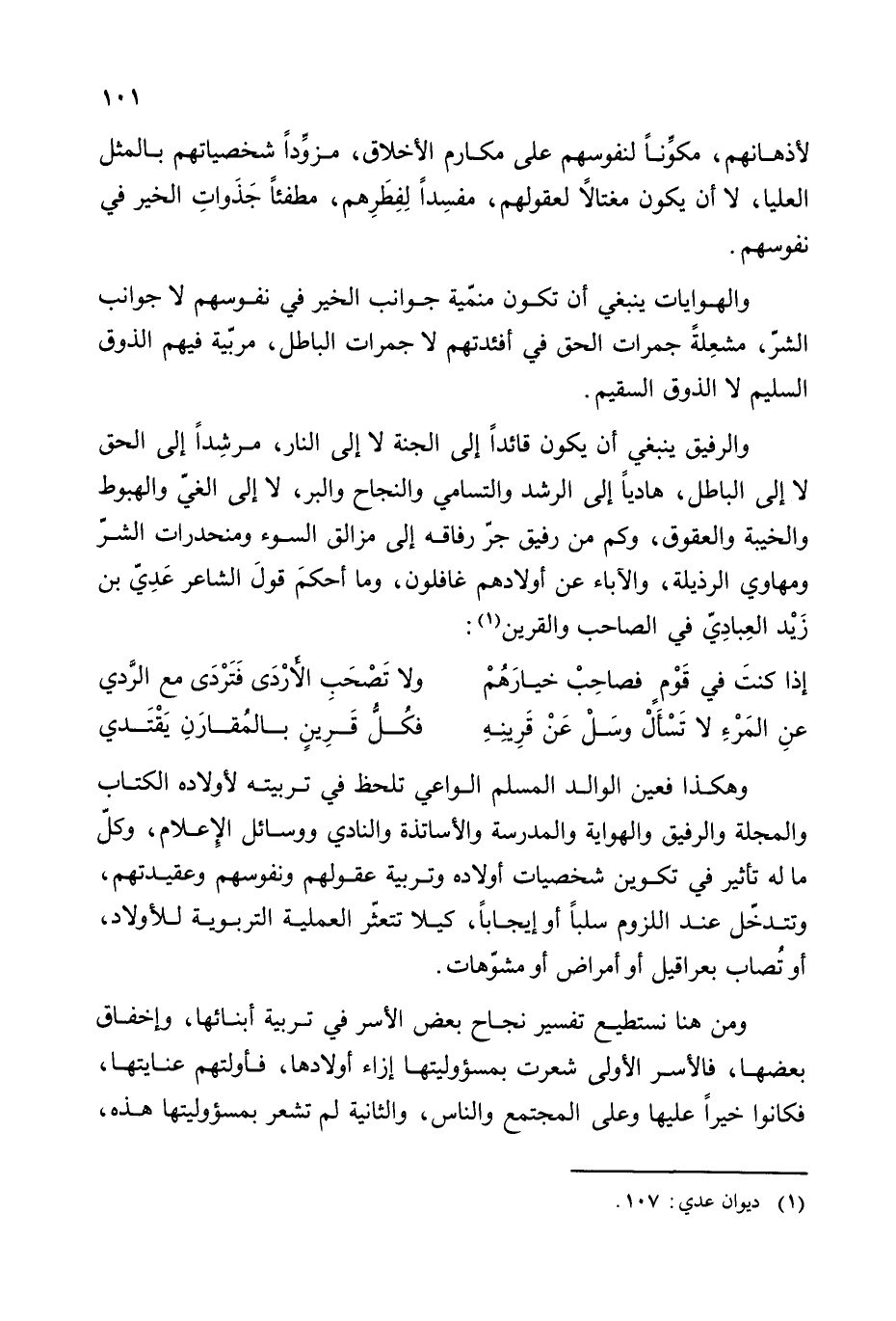 لا إلى الباطل، هاديا إلى الرشد والتسامي والنجاح والبر، لا إلى الغي والهبوط والخيبة والعقوق، وكم من رفيق جر رفاقه إلى مزالق السوء ومنحدرات الشر ومهاوي الرذيلة، والآباء عن أولادهم غافلون، وما أحكم قول الشاعر عدي بن زيد العبادي في الصاحب والقرين (¬1):