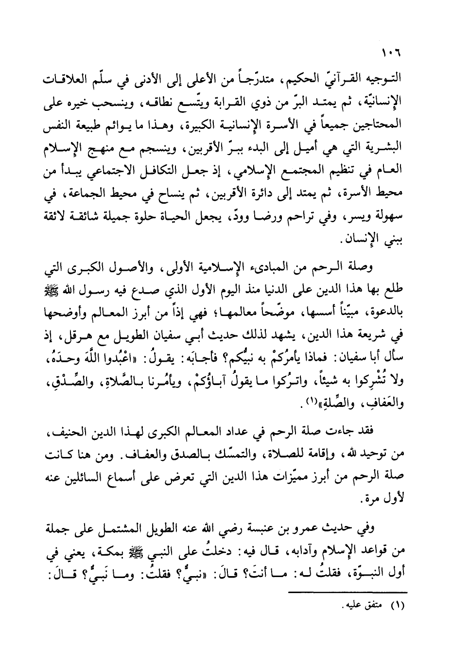 وصلة الرحم من المبادئ الإسلامية الأولى، والأصول الكبرى التي طلع بها هذا الدين على الدنيا منذ اليوم الأول الذي صدع فيه رسول الله - صلى الله عليه وسلم - بالدعوة، مبينا أسسها، موضحا معالمها؛ فهي إذا من أبرز المعالم وأوضحها في شريعة هذا الدين، يشهد لذلك حديث أبي سفيان الطويل مع هرقل، إذ سأل أبا سفيان: فماذا يأمركم به نبيكم؟ فأجابه: يقول: ((اعبدوا الله وحده، ولا تشركوا به شيئا، واتركوا ما يقول آباؤكم، ويأمرنا بالصلاة، والصدق، والعفاف، والصلة)) (¬1).