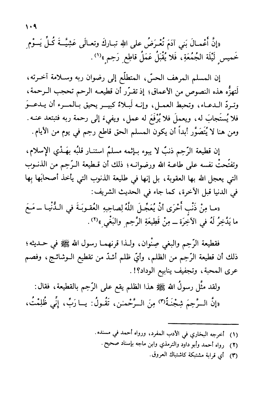 ((إن أعمال بني آدم تعرض على الله تبارك وتعالى عشية كل يوم خميس ليلة الجمعة، فلا يقبل عمل قاطع رحم)) (¬1).