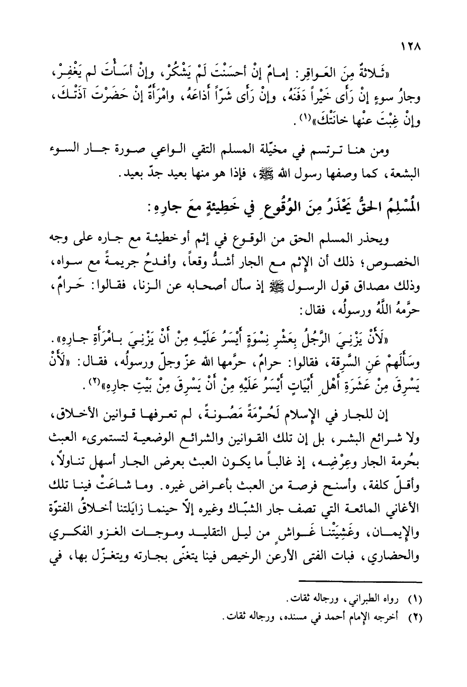 إن للجار في الإسلام لحرمة مصونة، لم تعرفها قوانين الأخلاق، ولا شرائع البشر، بل إن تلك القوانين والشرائع الوضعية لتستمرئ العبث بحرمة الجار وعرضه، إذ غالبا ما يكون العبث بعرض الجار أسهل تناولا، وأقل كلفة، وأسنح فرصة من العبث بأعراض غيره. وما شاعت فينا تلك الأغاني المائعة التي تصف جار الشباك وغيره إلا حينما زايلتنا أخلاق الفتوة والإيمان، وغشيتنا غواش من ليل التقليد وموجات الغزو الفكري والحضاري، فبات الفتى الأرعن الرخيص فينا يتغنى بجارته ويتغزل بها، في