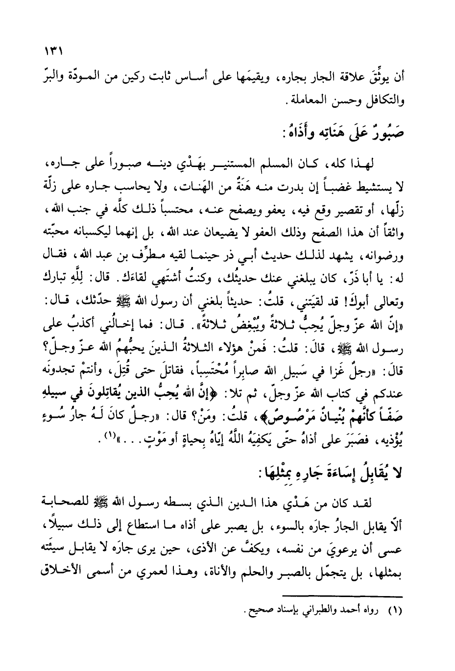 لهذا كله، كان المسلم المستنير بهدي دينه صبورا على جاره، لا يستشيط غضبا إن بدرت منه هنة من الهنات، ولا يحاسب جاره على زلة زلها، أو تقصير وقع فيه، يعفو ويصفح عنه، محتسبا ذلك كله في جنب الله، واثقا أن هذا الصفح وذلك العفو لا يضيعان عند الله، بل إنهما ليكسبانه محبته ورضوانه، يشهد لذلك حديث أبي ذر حينما لقيه مطرف بن عبد الله، فقال له: يا أبا ذر، كان يبلغني عنك حديثك، وكنت أشتهي لقاكك. قال: لله تبارك وتعالى أبوك! قد لقيتني، قلت: حديثا بلغني أن رسول الله - صلى الله عليه وسلم - حدثك، قال: ((إن الله عز وجل يحب ثلاثة ويبغض ثلاثة)). قال: فما إخالني أكذب على رسول الله - صلى الله عليه وسلم -، قلت: فمن هؤلاء الثلاثة الذين يحبهم الله عز وجل؟ قال: ((رجل غزا في سبيل الله صابرا محتسبا، فقاتل حتى قتل، وأنتم تجدونه عندكم في كتاب الله عز وجل، ثم تلا: {إِنَّ اللَّهَ يُحِبُّ الَّذِينَ يُقَاتِلُونَ فِي سَبِيلِهِ صَفًّا كَأَنَّهُمْ بُنْيَانٌ مَرْصُوصٌ}، قلت: ومن؟ قال: ((رجل كان له جار سوء يؤذيه، فصبر على أذاه حتى يكفيه الله إياه بحياة أو موت ... )) (¬1).