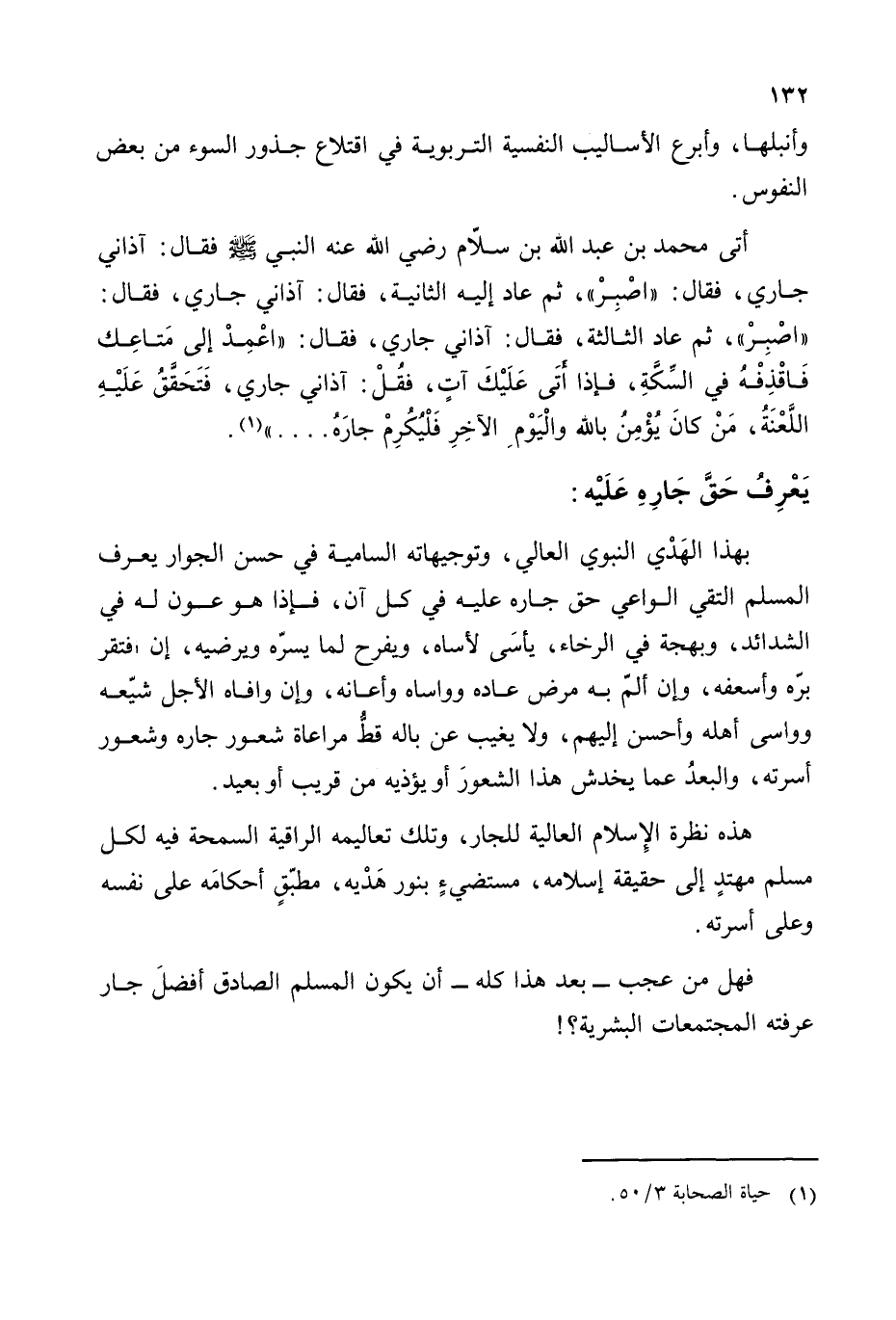 بهذا الهدي النبوي العالي، وتوجيهاته السامية في حسن الجوار يعرف المسلم التقي الواعي حق جاره عليه في كل آن، فإذا هو عون له في الشدائد، وبهجة في الرخاء، يأسى لأساه، ويفرح لما يسره ويرضيه، إن افتقر بره وأسعفه، وإن ألم به مرض عاده وواساه وأعانه، وإن وافاه الأجل شيعه وواسى أهله وأحسن إليهم، ولا يغيب عن باله قط مراعاة شعور جاره وشعور أسرته، والبعد عما يخدش هذا الشعور أو يؤذيه من قريب أو بعيد.
