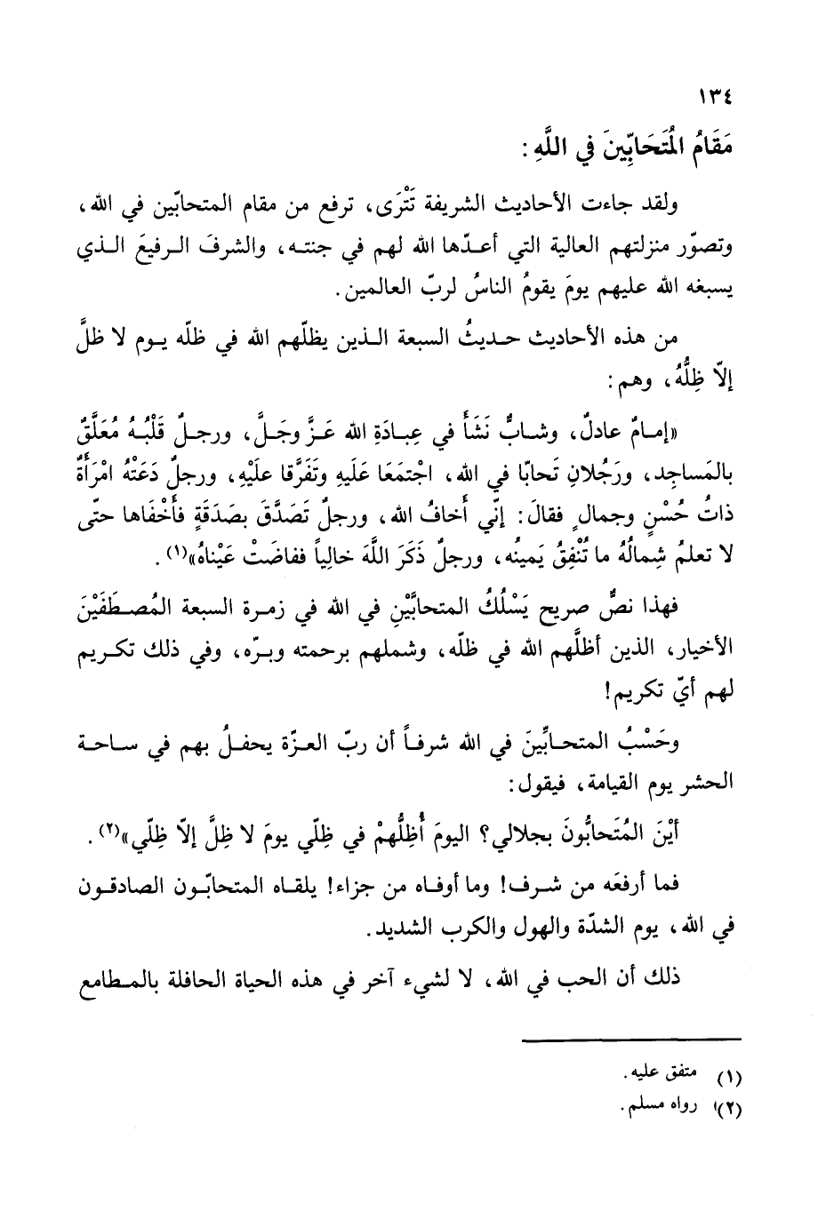 ولقد جاءت الأحاديث الشريفة تترى، ترفع من مقام المتحابين في الله، وتصور منزلتهم العالية التي أعدها الله لهم في جنته، والشرف الرفيع الذي يسبغه الله عليهم يوم يقوم الناس لرب العالمين.