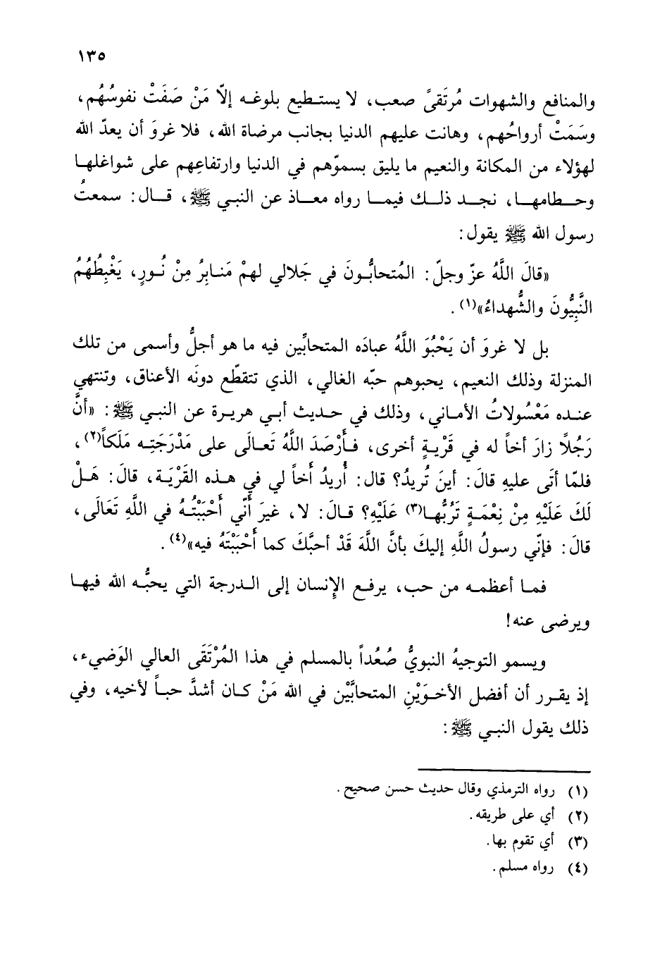 بل لا غرو أن يحبو الله عباده المتحابين فيه ما هو أجل وأسمى من تلك المنزلة وذلك النعيم، يحبوهم حبه الغالي، الذي تتقطع دونه الأعناق، وتنتهي عنده معسولات الأماني، وذلك في حديث أبي هريرة عن النبي - صلى الله عليه وسلم -: ((أن رجلا زار أخا له في قرية أخرى، فأرصد الله تعالى على مدرجته ملكا (¬2)، فلما أتى عليه قال: أين تريد؟ قال: أريد أخا لي في هذه القرية، قال: هل لك عليه من نعمة تربها (¬3) عليه؟ قال: لا، غير أني أحببته في الله تعالى، قال: فإني رسول الله إليك بأن الله قد أحبك كما أحببته فيه)) (¬4).