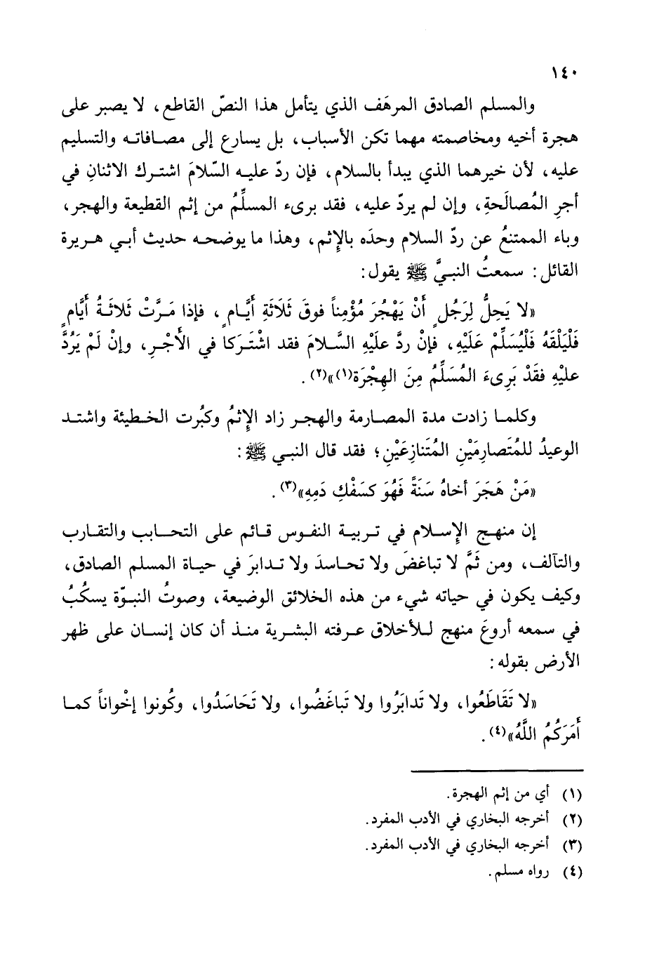 هجرة أخيه ومخاصمته مهما تكن الأسباب، بل يسارع إلى مصافاته والتسليم عليه، لأن خيرهما الذي يبدأ بالسلام، فإن رد عليه السلام اشترك الاثنان في أجر المصالحة، وإن لم يرد عليه، فقد برئ المسلم من إثم القطيعة والهجر، وباء الممتنع عن رد السلام وحده بالإثم، وهذا ما يوضحه حديث أبي هريرة القائل: سمعت النبي - صلى الله عليه وسلم - يقول: