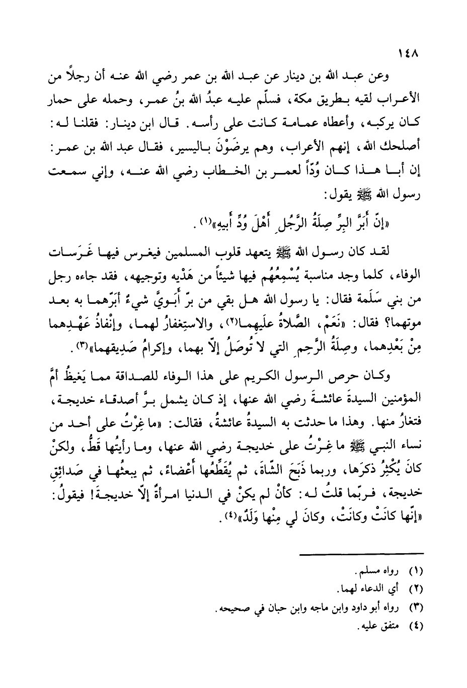 وعن عبد الله بن دينار عن عبد الله بن عمر رضي الله عنه أن رجلا من الأعراب لقيه بطريق مكة، فسلم عليه عبد الله بن عمر، وحمله على حمار كان يركبه، وأعطاه عمامة كانت على رأسه. قال ابن دينار: فقلنا له: أصلحك الله، إنهم الأعراب، وهم يرضون باليسير، فقال عبد الله بن عمر: إن أبا هذا كان ودا لعمر بن الخطاب رضي الله عنه، وإني سمعت رسول الله - صلى الله عليه وسلم - يقول: