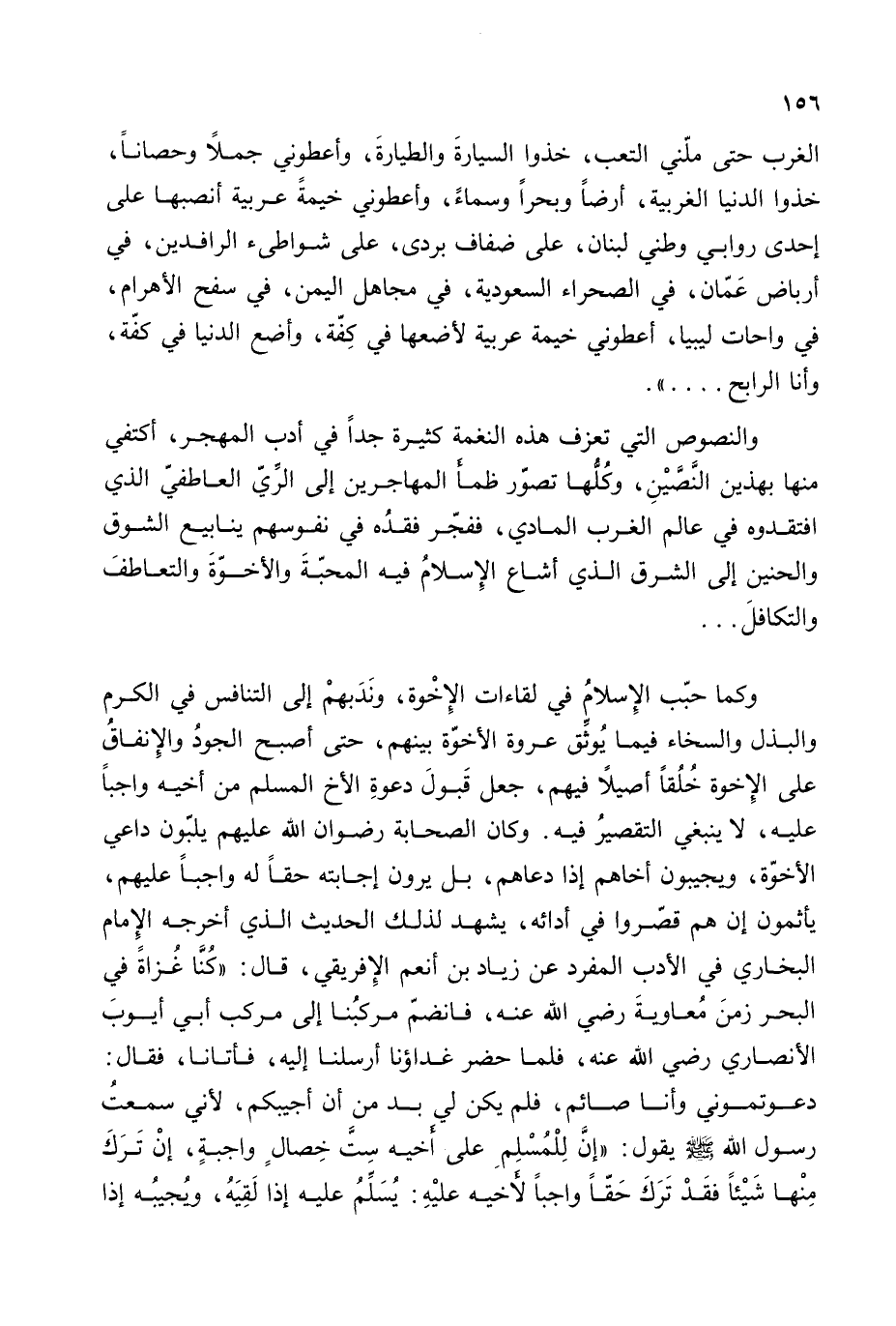 ((ولو تبخر عمري كله قصيرا في أي صعيد عربي، لحمدت الله على حياة قصيرة عريضة في دنيا يقيم الله في قلوب أبنائها ... لقد تعبت في الغرب حتى ملني التعب، خذوا السيارة والطيارة، وأعطوني جملا وحصانا، خذوا الدنيا الغربية، أرضا وبحرا وسماء، وأعطوني خيمة عربية أنصبها على إحدى روابي وطني لبنان، على ضفاف بردى، على شواطىء الرافدين، في أرباض عمان، في الصحراء السعودية، في مجاهل اليمن، في سفح الأهرام، في واحات ليبيا، أعطوني خيمة عربية لأضعها في كفة، وأضع الدنيا في كفة، وأنا الرابح .... )).