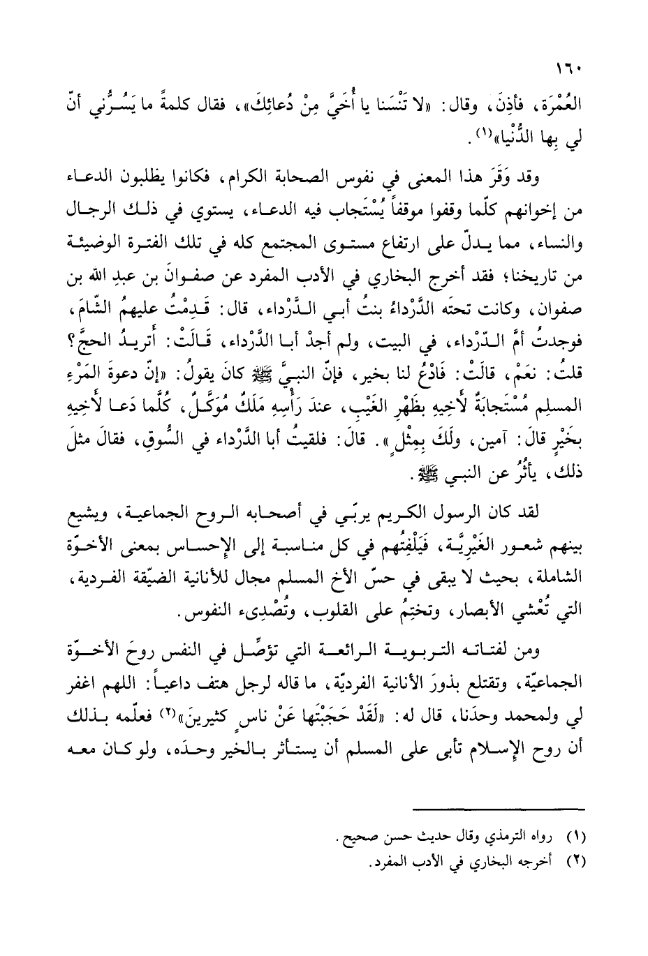 وقد وقر هذا المعنى في نفوس الصحابة الكرام، فكانوا يطلبون الدعاء من إخوانهم كلما وقفوا موقفا يستجاب فيه الدعاء، يستوي في ذلك الرجال والنساء، مما يدل على ارتفاع مستوى المجتمع كله في تلك الفترة الوضيئة من تاريخنا؛ فقد أخرج البخاري في الأدب المفرد عن صفوان بن عبد الله بن صفوان، وكانت تحته الدرداء بنت أبي الدرداء، قال: قدمت عليهم الشام، فوجدت أم الدرداء، في البيت، ولم أجد أبا الدرداء، قالت: أتريد الحج؟