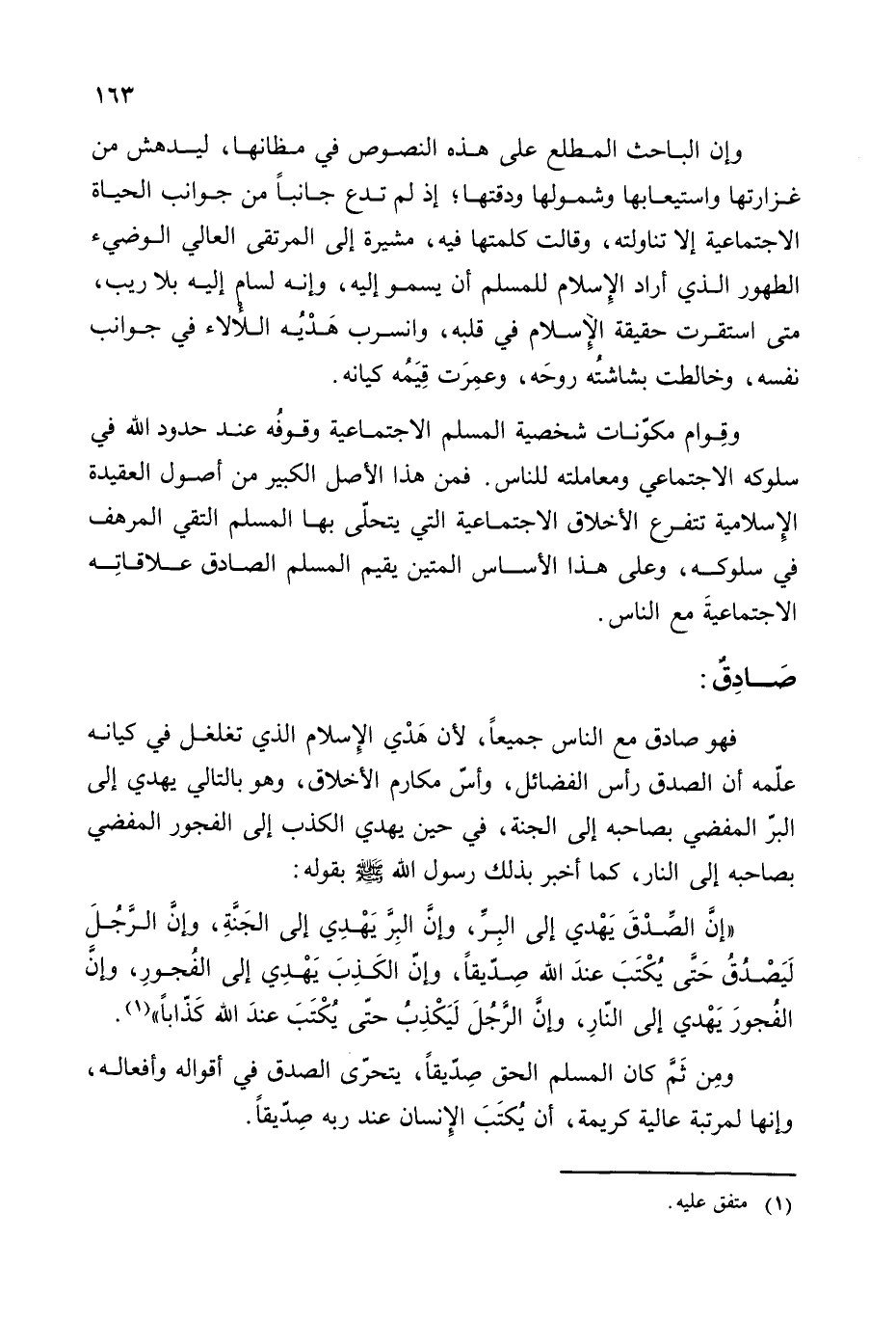 فهو صادق مع الناس جميعا، لأن هدي الإسلام الذي تغلغل في كيانه علمه أن الصدق رأس الفضائل، وأس مكارم الأخلاق، وهو بالتالي يهدي إلى البر المفضي بصاحبه إلى الجنة، في حين يهدي الكذب إلى الفجور المفضي بصاحبه إلى النار، كما أخبر بذلك رسول الله - صلى الله عليه وسلم - بقوله: