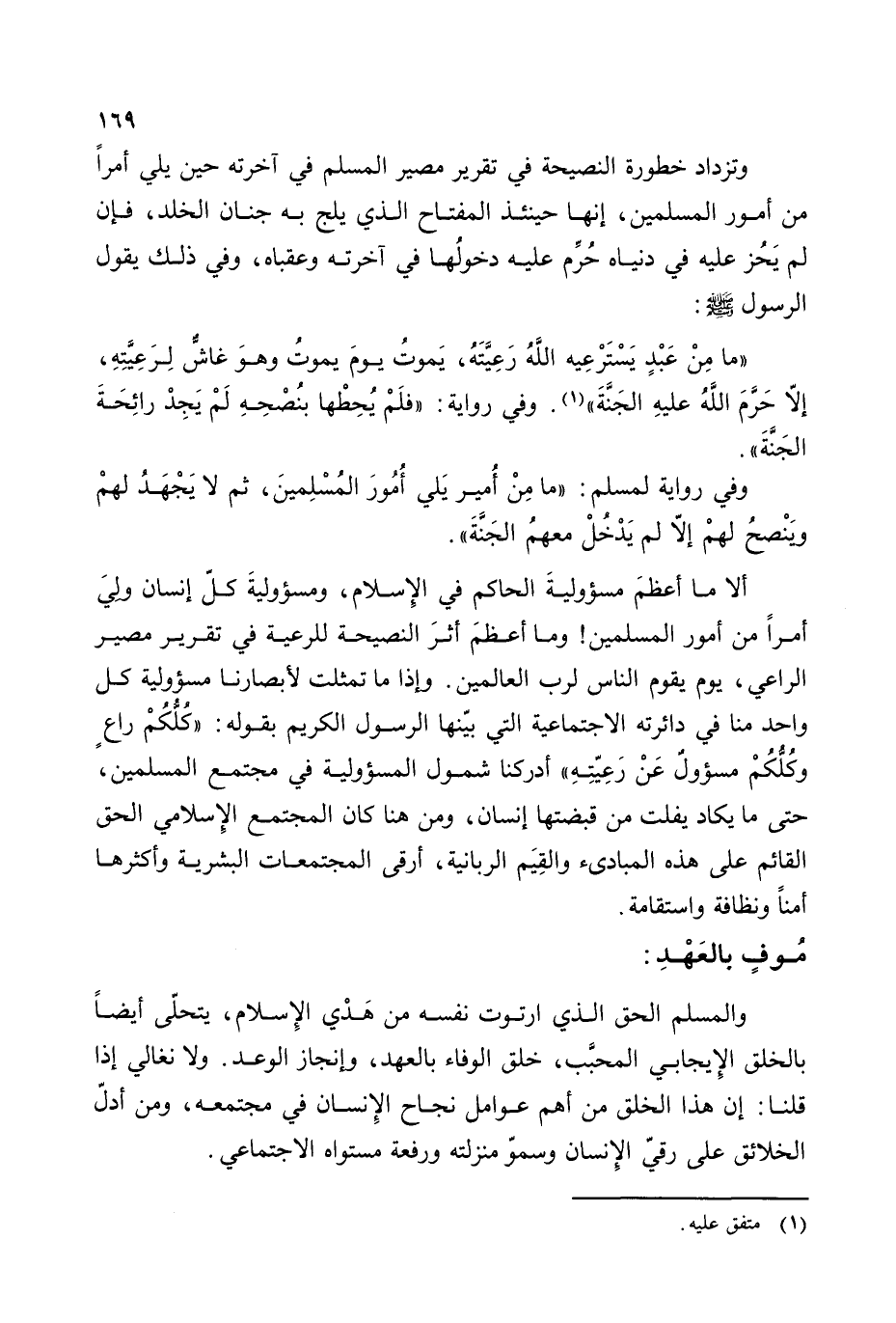 ألا ما أعظتم مسؤولية الحاكم في الإسلام، ومسؤولية كل إنسان ولي أمرا من أمور المسلمين! وما أعظم أثر النصيحة للرعية في تقرير مصير الراعي، يوم يقوم الناس لرب العالمين. وإذا ما تمثلت لأبصارنا مسؤولية كل واحد منا في دائرته الاجتماعية التي بينها الرسول الكريم بقوله: ((كلكم راع وكلكم مسؤول عن رعيته) أدركنا شمول المسؤولية في مجتمع المسلمين، حتى ما يكاد يفلت من قبضتها إنسان، ومن هنا كان المجتمع الإسلامي الحق القائم على هذه المبادئ والقيم الربانية، أرقى المجتمعات البشرية وأكثرها أمنا ونظافة واستقامة.