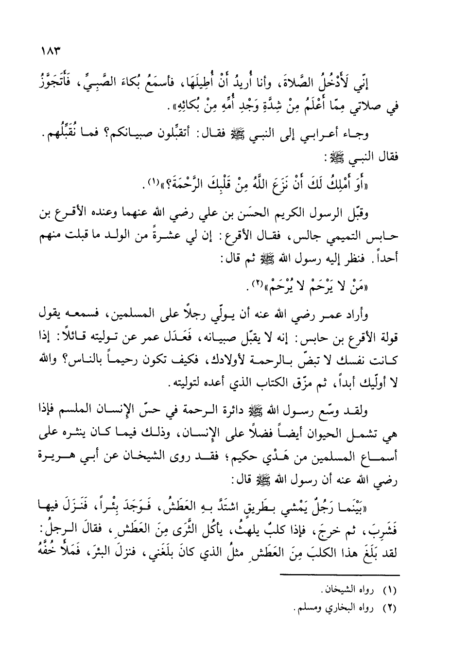 وجاء أعرابي إلى النبي - صلى الله عليه وسلم - فقال: أتقبلون صبيانكم؟ فما نقبلهم. فقال النبي - صلى الله عليه وسلم -: