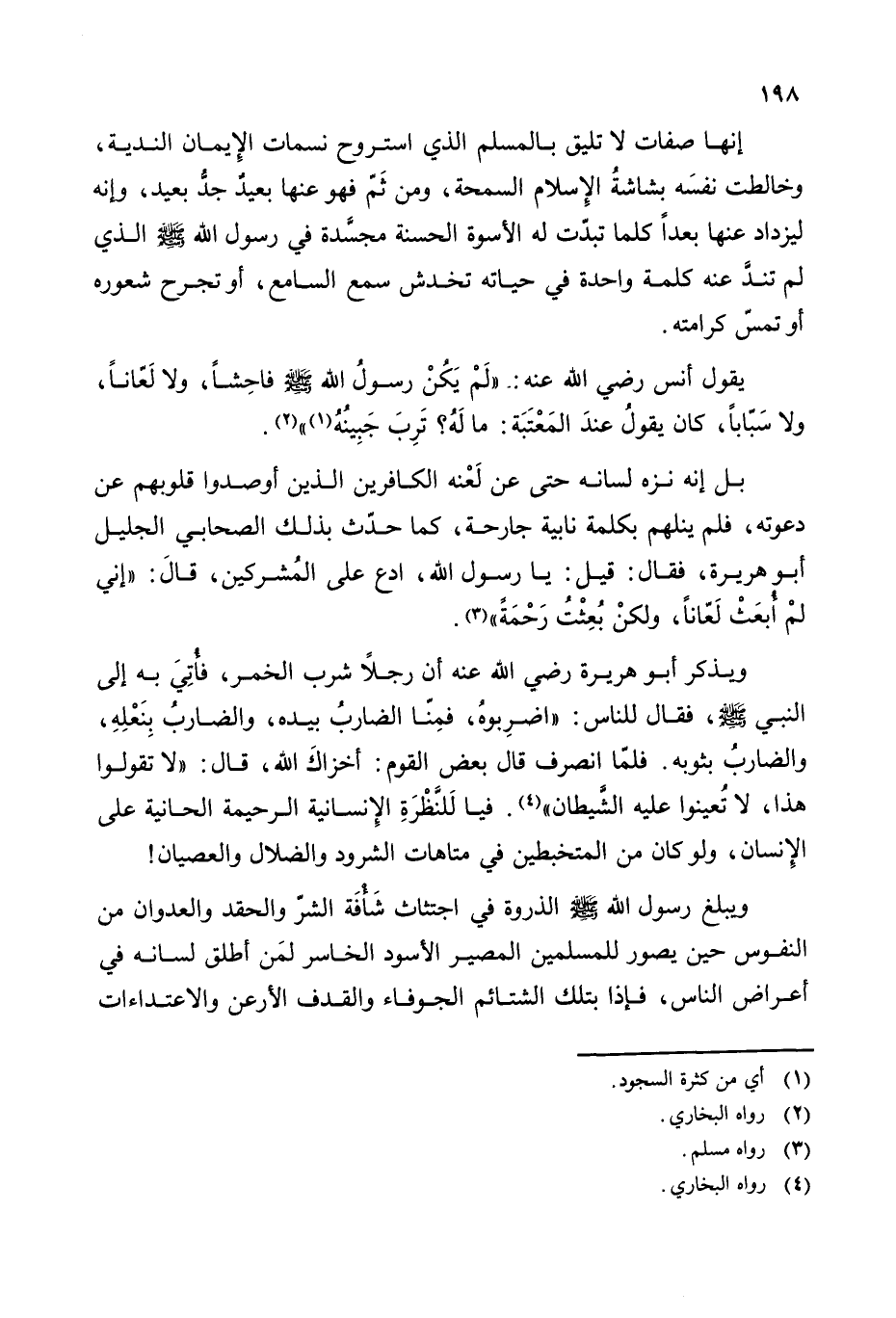 إنها صفات لا تليق بالمسلم الذي استروح نسمات الإيمان الندية، وخالطت نفسه بشاشة الإسلام السمحة، ومن هنا هو عنها بعيد جد بعيد، وإنه ليزداد عنها بعدا كلما تبدت له الأسوة الحسنة مجسدة في رسول الله - صلى الله عليه وسلم - الذي لم تند عنه كلمة واحدة فى حياته تخدش سمع السامع، أو تجرح شعوره أو تمس كرامته.