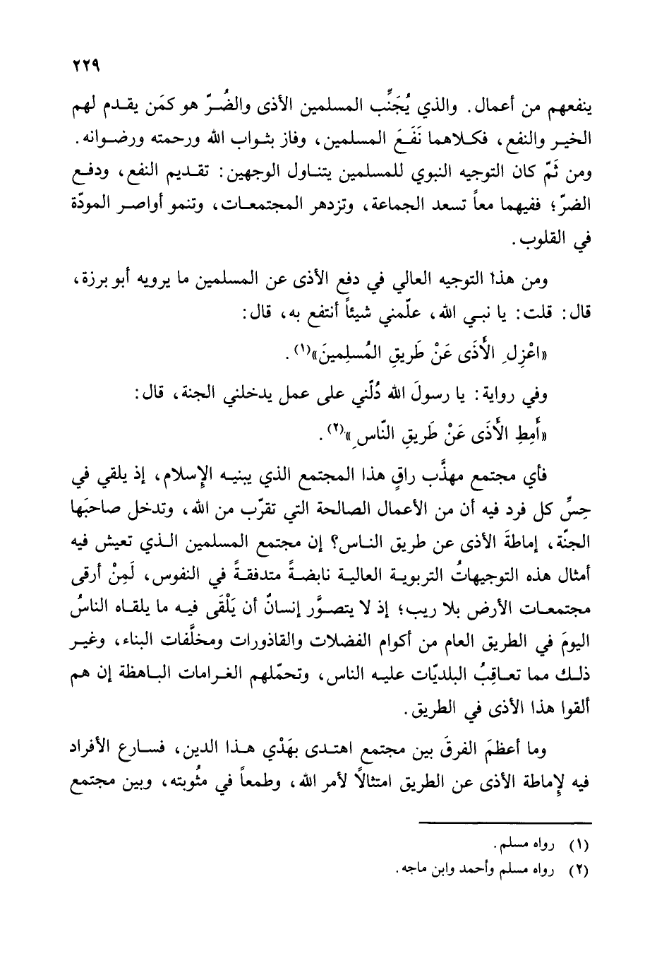حس كل فرد فيه أن من الأعمال الصالحة التي تقرب من الله، وتدخل صاحبها الجنة، إماطة الأذى عن طريق الناس؟ إن مجتمع المسلمين الذي تعيش فيه أمثال هذه التوجيهات التربوية العالية نابضة متدفقة في النفوس، لمن أرقى مجتمعات الأرض بلا ريب؛ إذ لا يتصور إنسان أن يلقى فيه ما يلقاه الناس اليوم في الطريق العام من أكوام الفضلات والقاذورات ومخلفات البناء، وغير ذلك مما تعاتب البلديات عليه الناس، وتحملهم الغرامات الباهظة إن هم ألقوا هذا الأذى في الطريق.