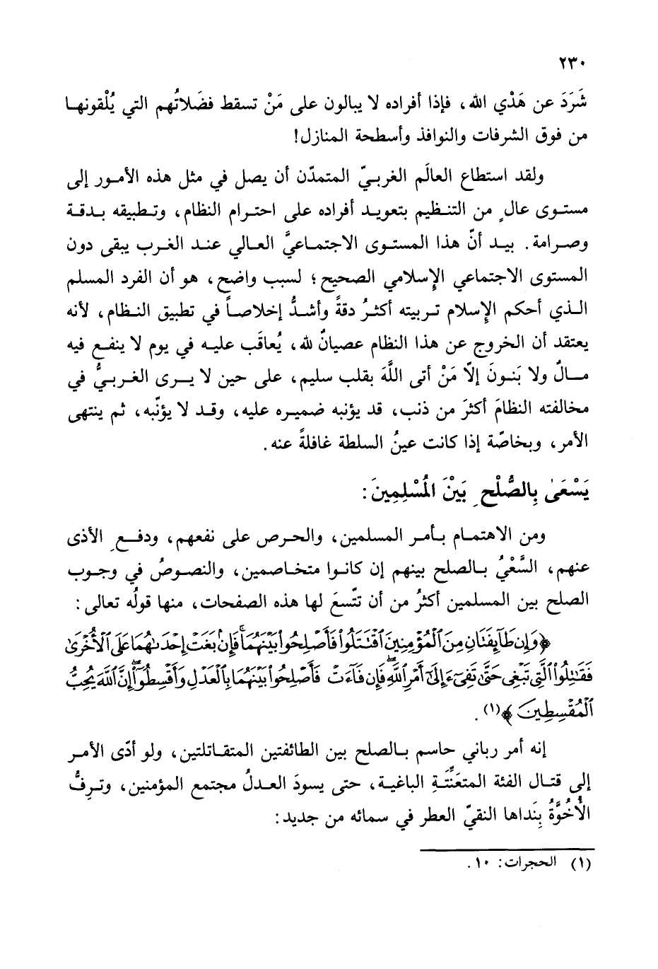 إنه أمر رباني حاسم بالصلح بين الطائفتين المتقاتلتين، ولو أدى الأمر إلى قتال الفئة المتعنتة الباغية، حتى يسود العدل مجتمع المؤمنين، وترف الأخوة بنداها النقي العطر في سمائه من جديد: