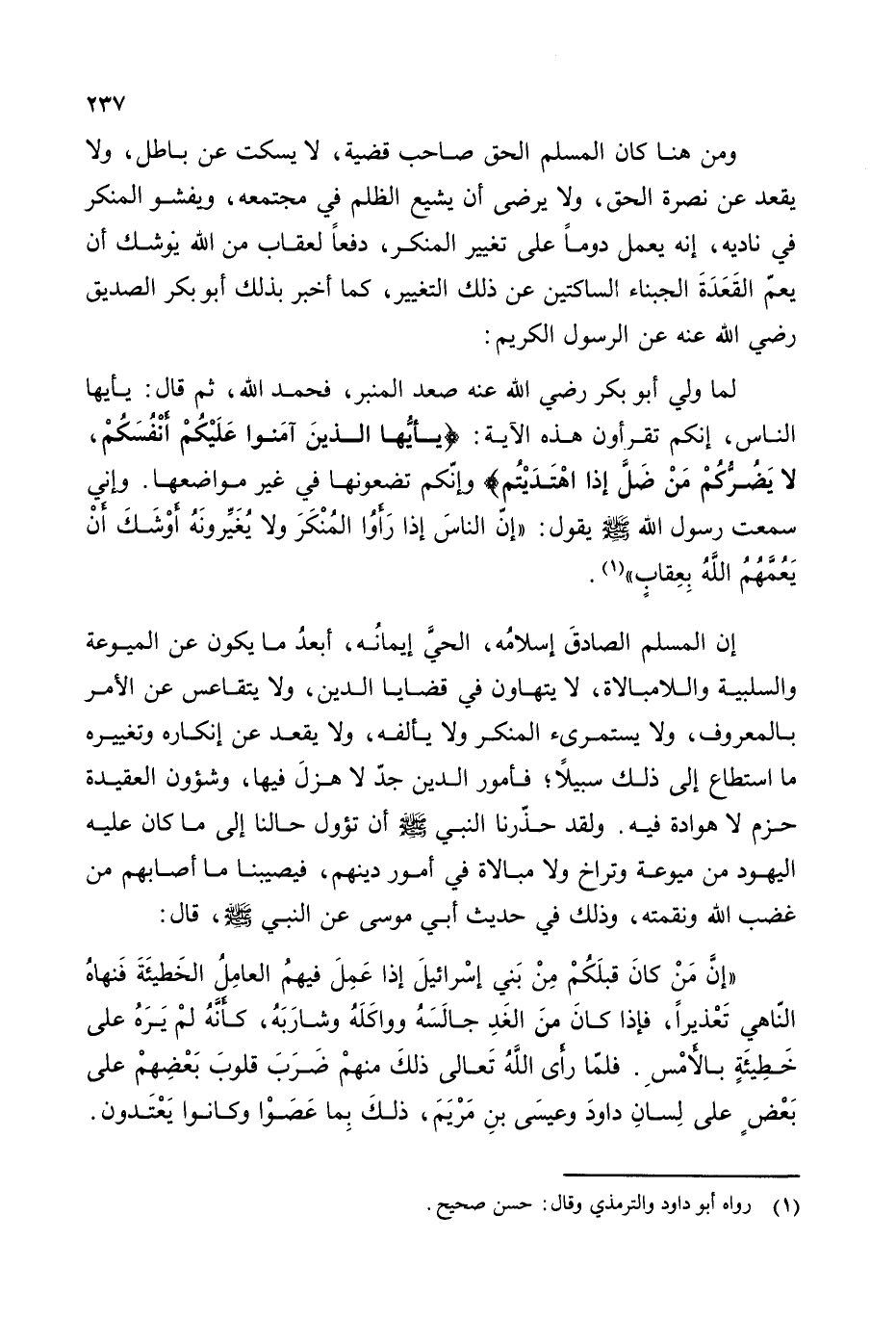 ومن هنا كان المسلم الحق صاحب قضية، لا يسكت عن باطل، ولا يقعد عن نصرة الحق، ولا يرضى أن يشيع الظلم في مجتمعه، ويفشو المنكر في ناديه، إنه يعمل دوما على تغيير المنكر، دفعا لعقاب من الله يوشك أن يعم القعدة الجبناء الساكتين عن ذلك التغيير، كما أخبر بذلك أبو بكر الصديق رضي الله عنه عن الرسول الكريم:
