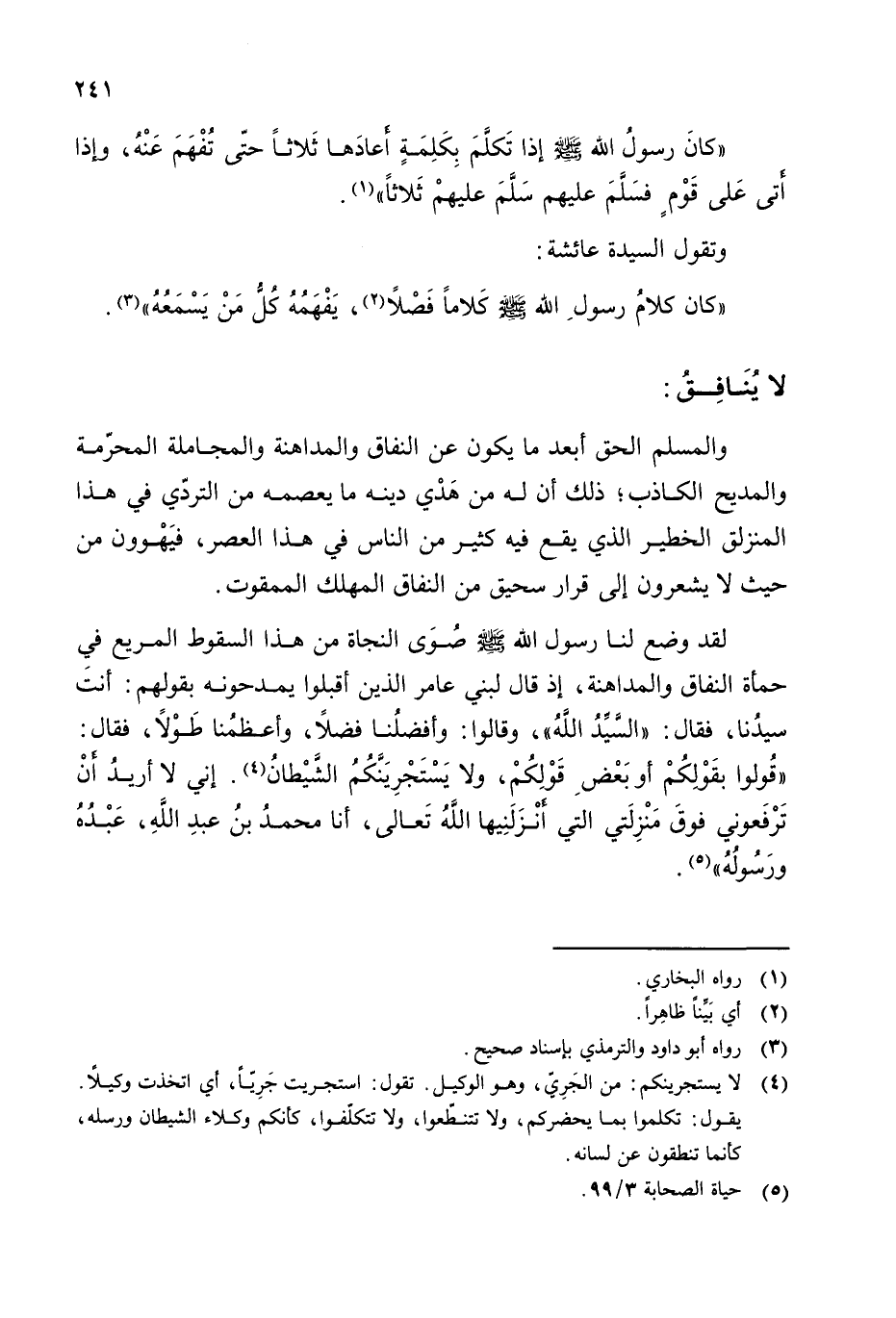لقد وضع لنا رسول الله - صلى الله عليه وسلم - صوى النجاة من هذا السقوط المريع في حمأة النفاق والمداهنة، إذ قال لبني عامر الذين أقبلوا يمدحونه بقولهم: أنت سيدنا، فقال: ((السيد الله))، وقالوا: وأفضلنا فضلا، وأعظمنا طولا، فقال: ((قولوا بقولكم أو بعض قولكم، ولا يستجرينكم الشيطان (¬4). إني لا أريد أن ترفعوني فوق منزلتي التي أنزلنيها الله تعالى، أنا محمد بن عبد الله، عبده ورسوله)) (¬5).