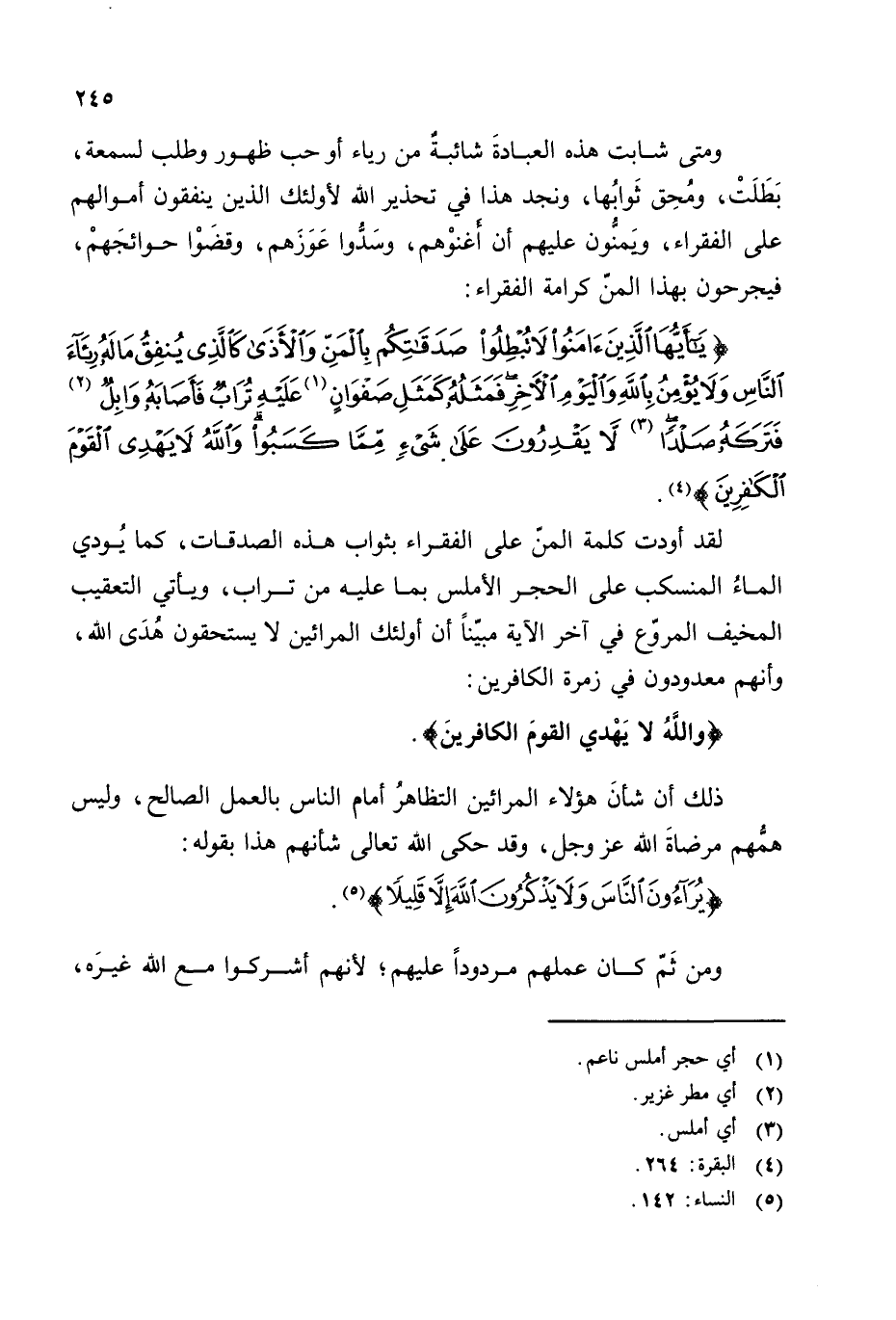 {يَا أَيُّهَا الَّذِينَ آمَنُوا لَا تُبْطِلُوا صَدَقَاتِكُمْ بِالْمَنِّ وَالْأَذَى كَالَّذِي يُنْفِقُ مَالَهُ رِئَاءَ النَّاسِ وَلَا يُؤْمِنُ بِاللَّهِ وَالْيَوْمِ الْآخِرِ فَمَثَلُهُ كَمَثَلِ صَفْوَانٍ (¬1) عَلَيْهِ تُرَابٌ فَأَصَابَهُ وَابِلٌ (¬2) فَتَرَكَهُ صَلْدًا (¬3) لَا يَقْدِرُونَ عَلَى شَيْءٍ مِمَّا كَسَبُوا وَاللَّهُ لَا يَهْدِي الْقَوْمَ الْكَافِرِينَ} (¬4).