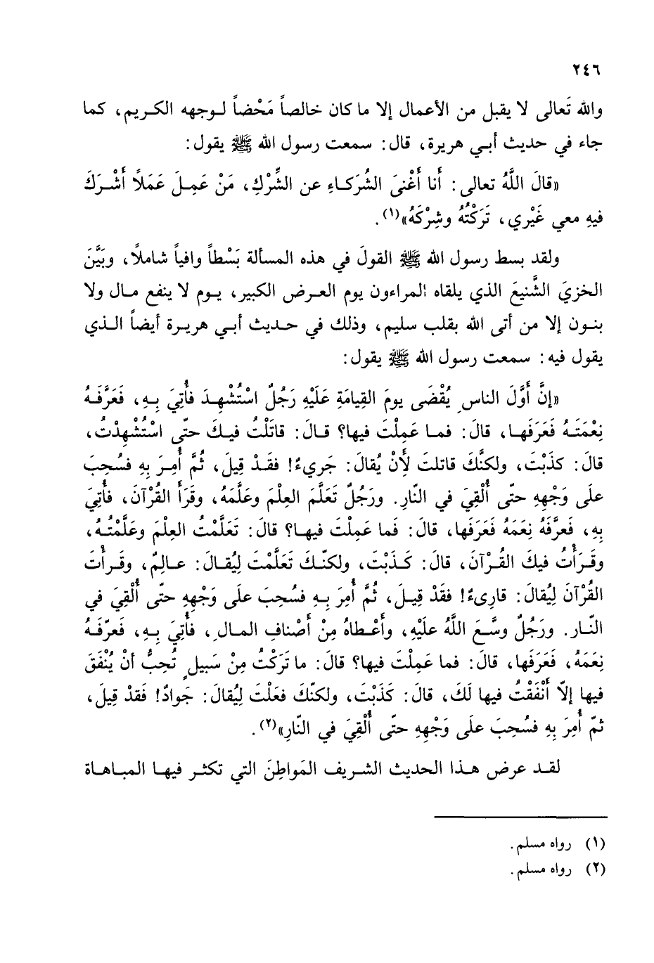((إن أول الناس يقضى يوم القيامة عليه رجل استشهد فأتي به، فعرفه نعمته فعرفها، قال: فما عملت فيها؟ قال: قاتلت فيك حتى استشهدت، قال: كذبت، ولكنك قاتلت لأن يقال: جريء! فقد قيل، ثم أمر به فسحب على وجهه حتى ألقي في النار. ورجل تعلم العلم وعلمه، وقرأ القرآن، فأتي به، فعرفه نعمه فعرفها، قال: فما عملت فيها؟ قال: تعلمت العلم وعلمته، وقرأت فيك القرآن، قال: كذبت، ولكنك تعلمت ليقال: عالم، وقرأت القرآن ليقال: قارئ! فقد قيل، ثم أمر به فسحب على وجهه حتى ألقي في النار. ورجل وسع الله عليه، وأعطاه من أصناف المال، فأتي بيه، فعرفه نعمه، فعرفها، قال: فما عملت فيها؟ قال: ما تركت من سبيل تحب أن ينفق فيها إلا أنفقت فيها لك، قال: كذبت، ولكنك فعلت ليقال: جواد! فقد قيل، ثم أمر به فسحب على وجهه حتى ألقي في النار)) (¬2).