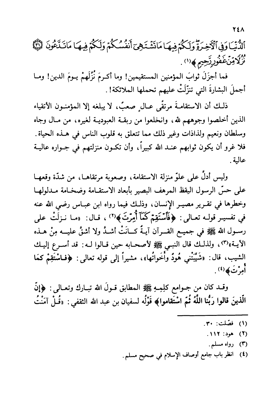 وقد كان من جوامع كلمه - صلى الله عليه وسلم - المطابق قول الله تبارك وتعالى: {إِنَّ الَّذِينَ قَالُوا رَبُّنَا اللَّهُ ثُمَّ اسْتَقَامُوا} قوله لسفيان بن عبد الله الثقفي: ((قل آمنت