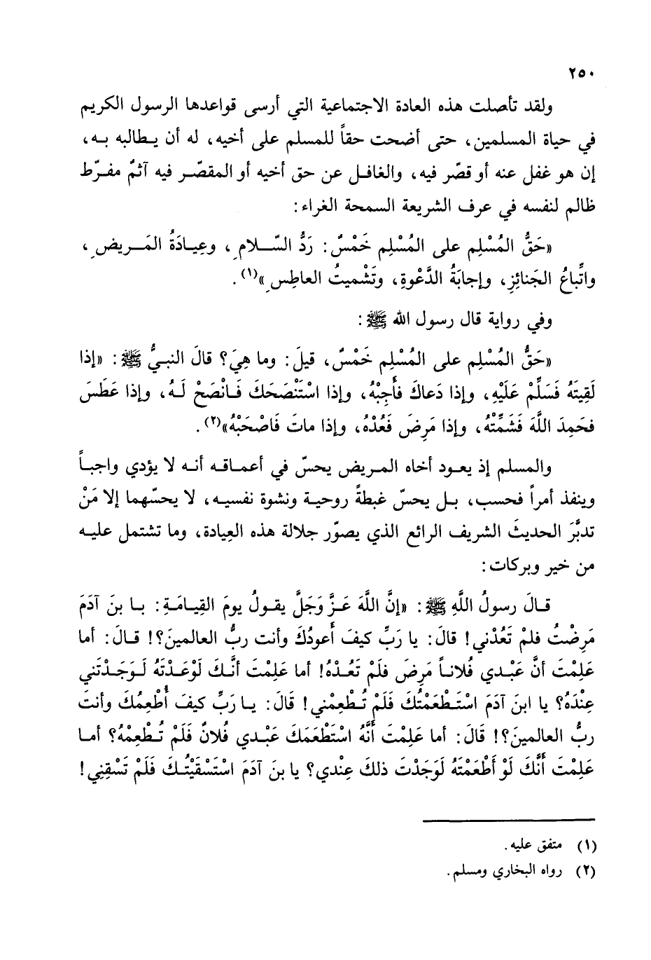 قال رسول الله - صلى الله عليه وسلم -: ((إن الله عز وجل يقول يوم القيامة: يا ابن آدم مرضت فلم تعدني! قال: يا رب كيف أعودك وأنت رب العالمين؟! قال: أما علمت أن عبدي فلانا مرض فلم تعده! أما علمت أنك لو عدته لوجدتني عنده؟ يا ابن آدم استطعمتك فلم تطعمني! قال: يا رب كيف أطعمك وأنت رب العالمين؟! قال: أما علمت أنه استطعمك عبدي فلان فلم تطعمه؟ أما علمت أنك لو أطعمته لوجدت ذلك عندي؟ يا ابن آدم استسقيتك فلم تسقني!