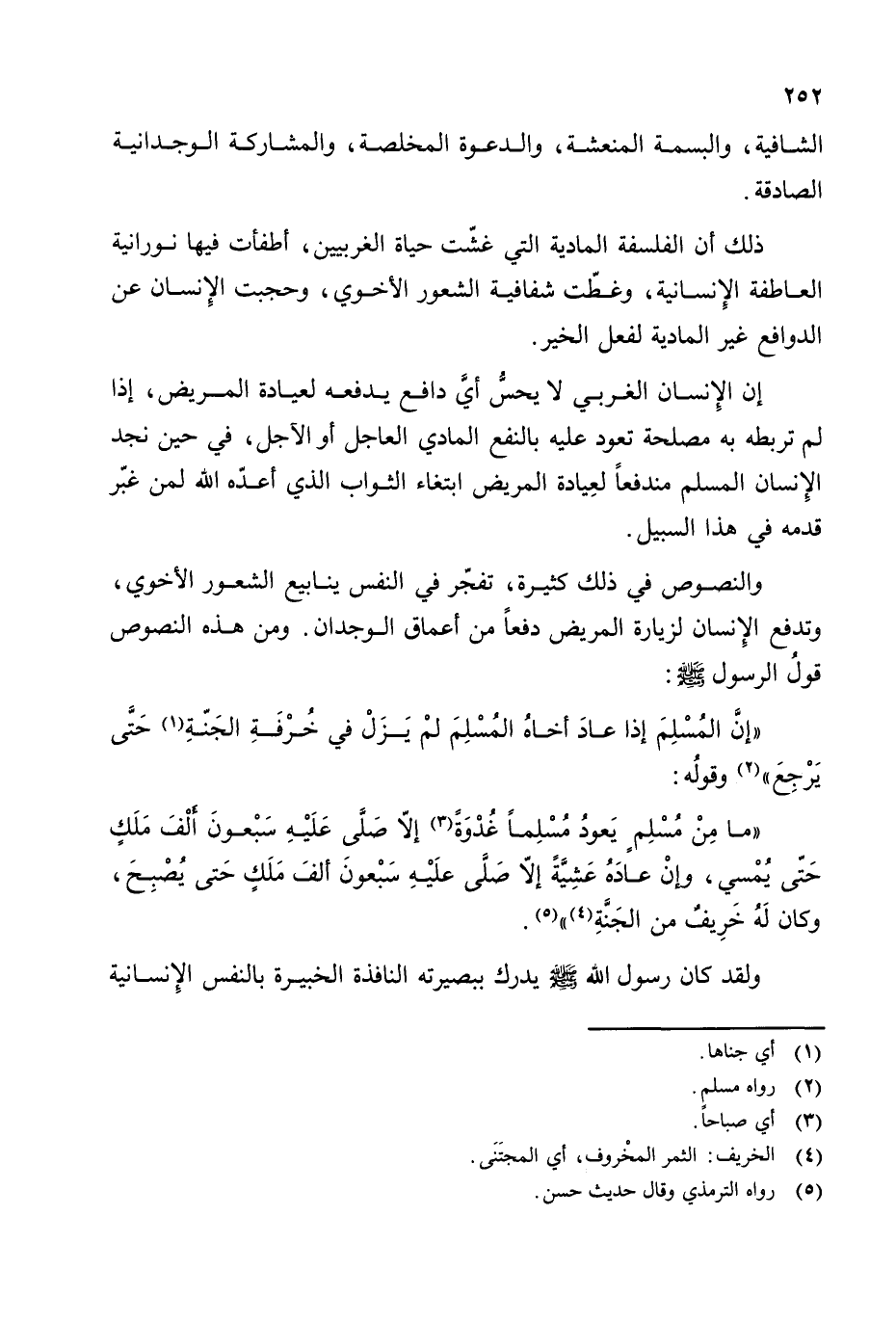 والنصوص في ذلك كثيرة، تفجر في النفس ينابيع الشعور الأخوي، وتدفع الإنسان لزيارة المريض دفعا من أعماق الوجدان. ومن هذه النصوص قول الرسول - صلى الله عليه وسلم -: