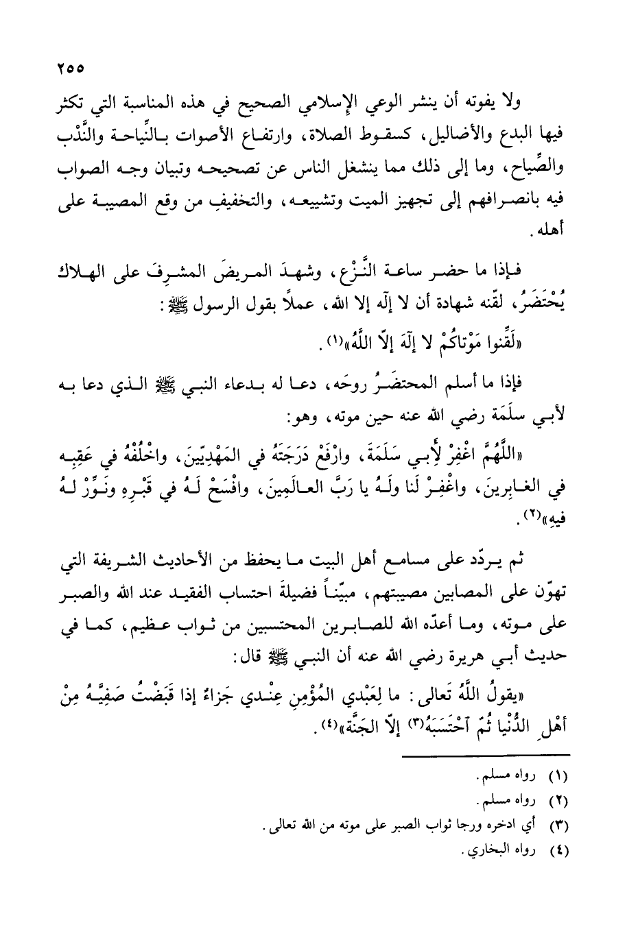 ثم يردد على مسامع أهل البيت ما يحفظ من الأحاديث الشريفة التي تهون على المصابين مصيبتهم، مبينا فضيلة احتساب الفقيد عند الله والصبر على موته، وما أعده الله للصابرين المحتسبين من ثواب عظيم، كما في حديث أبي هريرة رضي الله عنه أن النبي - صلى الله عليه وسلم - قال: