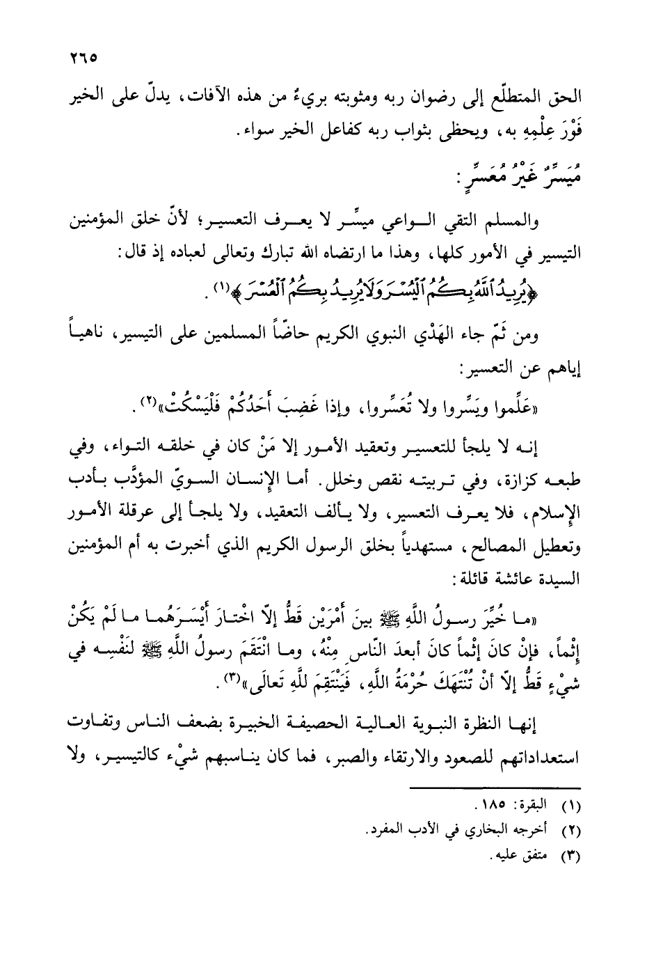 والمسلم التقي الواعي مسير لا يعرف التعسير؛ لأن خلق المؤمنين التيسير في الأمور كلها، وهذا ما ارتضاه الله تبارك وتعالى لعباده إذ قال: {يُرِيدُ اللَّهُ بِكُمُ الْيُسْرَ وَلَا يُرِيدُ بِكُمُ الْعُسْرَ} (¬1).