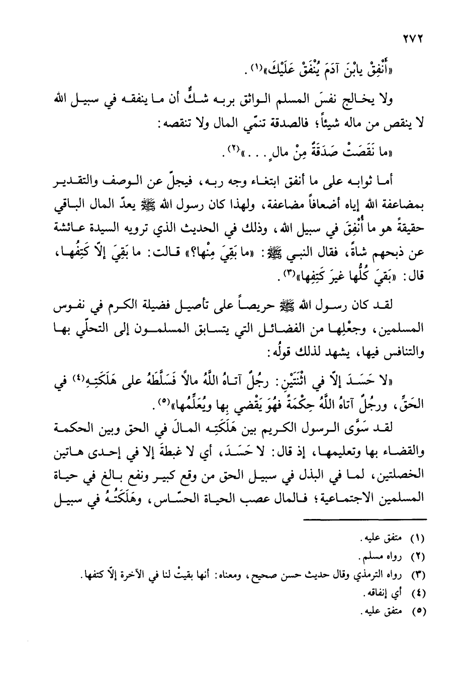 أما ثوابه على ما أنفق ابتغاء وجه ربه، فيجل عن الوصف والتقدير بمضاعفة الله إياه أضعافا مضاعفة، ولهذا كان رسول الله - صلى الله عليه وسلم - يعد المال الباقي حقيقة هو ما انفق في سبيل الله، وذلك في الحديث الذي ترويه السيدة عائشة عن ذبحهم شاة، فقال النبي - صلى الله عليه وسلم -: ((ما بقي منها؟)) قالت: ما بقي إلا كتفها، قال: ((بقي كلها غير كتفها)) (¬3).