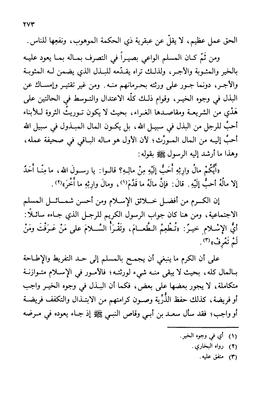 على أن الكرم ما ينبغي أن يجمح بالمسلم إلى حد التفريط والإطاحة بالمال كله، بحيث لا يبقى منه شيء لورثته؛ فالأمور في الإسلام متوازنة متكاملة، لا يجور بعضها على بعض، فكما أن البذل في وجه الخير واجب أو فريضة، كذلك حفظ الذرية وصون كرامتهم من الابتذال والتكفف فريضة أو واجب؛ فقد سأل سعد بن أبي وقاص النبي - صلى الله عليه وسلم - إذ جاء يعوده في مرضه
