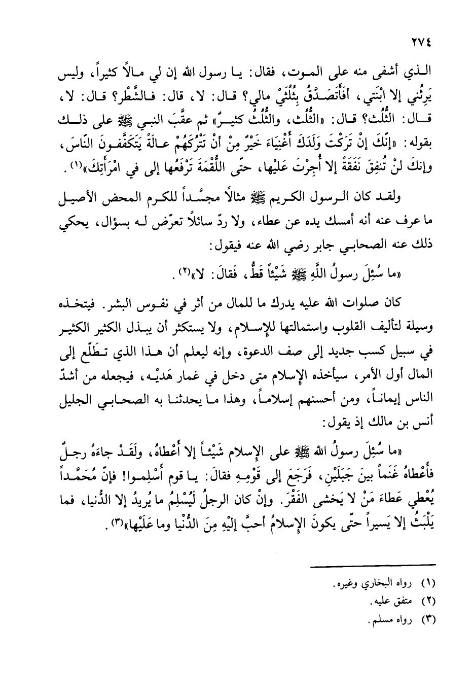 ((ما سئل رسول الله - صلى الله عليه وسلم - على الإسلام شيئا إلا أعطاه، ولقد جاءه رجل فأعطاه غنما بين جبلين، فرجع إلى قومه فقال: يا قوم أسلموا! فإن محمدا يعطي عطاء من لا يخشى الفقر. وإن كان الرجل ليسلم ما يريد إلا الدنيا، فما يلبث إلا يسيرا حتى يكون الإسلام أحب إليه من الدنيا وما عليها)) (¬3).