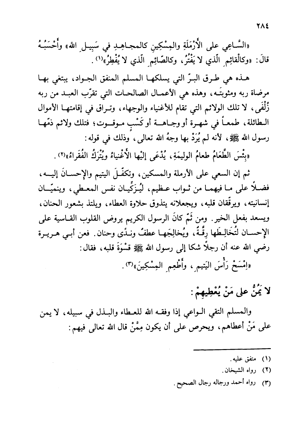 ثم إن السعي على الأرملة والمسكين، وتكفل اليتيم والإحسان إليه، فضلا على ما فيهما من ثواب عظيم، ليزكيان نفس المعطي، وينميان إنسانيته، ويرققان قلبه، ويجعلانه يتذوق حلاوة العطاء، ويلتذ بشعور الحنان، ويسعد بفعل الخير. ومن هنا كان الرسول الكريم يروض القلوب القاسية على الإحسان لتخالطها رقة، ويخالجها عطف وندى وحنان. فعن أبي هريرة رضي الله عنه أن رجلا شكا إلى رسول الله - صلى الله عليه وسلم - قسوة قلبه، فقال: