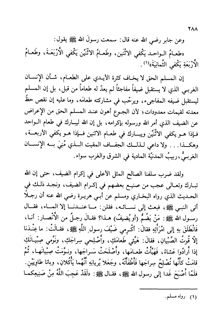 إن المسلم الحق لا يخاف كثرة الأيدي على الطعام، شأن الإنسان الغربي الذي لا يستقبل ضيفا مفاجئا لم يعد له طعاما من قبل، بل إن المسلم ليستقبل ضيفه المفاجئ، ويرحب في مشاركته طعامه، وما عليه إن نقص حظ معدته لقيمات معدودات؛ لأن الجوع أهون عند المسلم الحق من الإعراض عن الضيف الذي أمر الله رسوله بإكرامه، بل إن الله ليبارك في طعام الواحد فإذا هو يكفي الاثنين ويبارك في طعام الاثنين فإذا هو يكفي الأربعة، وهكذا ... ولا داعي لذلك الجفاف المقيت الذي مني به الإنسان الغربي، ربيب المدنية المادية في الشرق والغرب سواء.