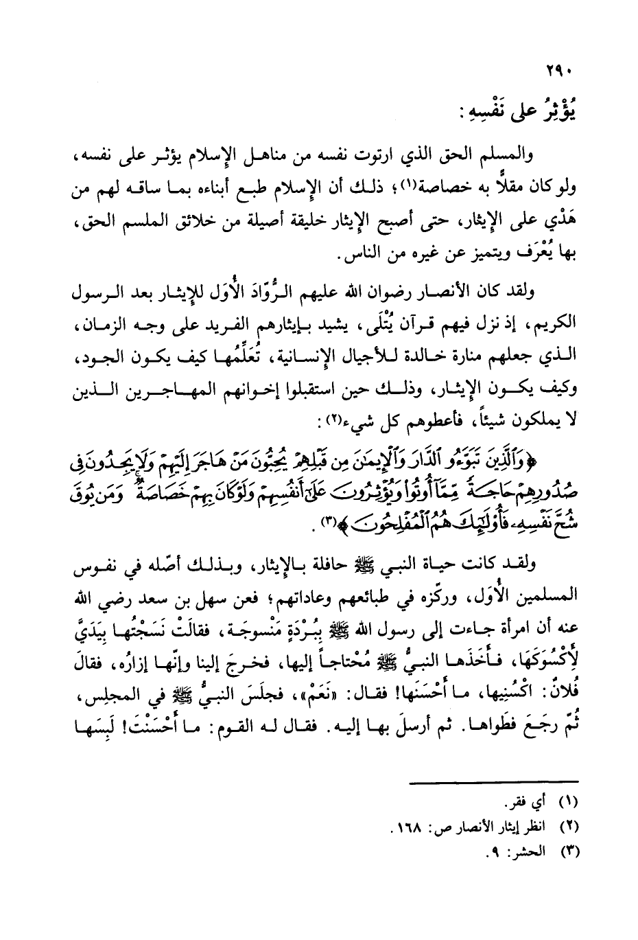 {وَالَّذِينَ تَبَوَّءُوا الدَّارَ وَالْإِيمَانَ مِنْ قَبْلِهِمْ يُحِبُّونَ مَنْ هَاجَرَ إِلَيْهِمْ وَلَا يَجِدُونَ فِي صُدُورِهِمْ حَاجَةً مِمَّا أُوتُوا وَيُؤْثِرُونَ عَلَى أَنْفُسِهِمْ وَلَوْ كَانَ بِهِمْ خَصَاصَةٌ وَمَنْ يُوقَ شُحَّ نَفْسِهِ فَأُولَئِكَ هُمُ الْمُفْلِحُونَ} (¬3).