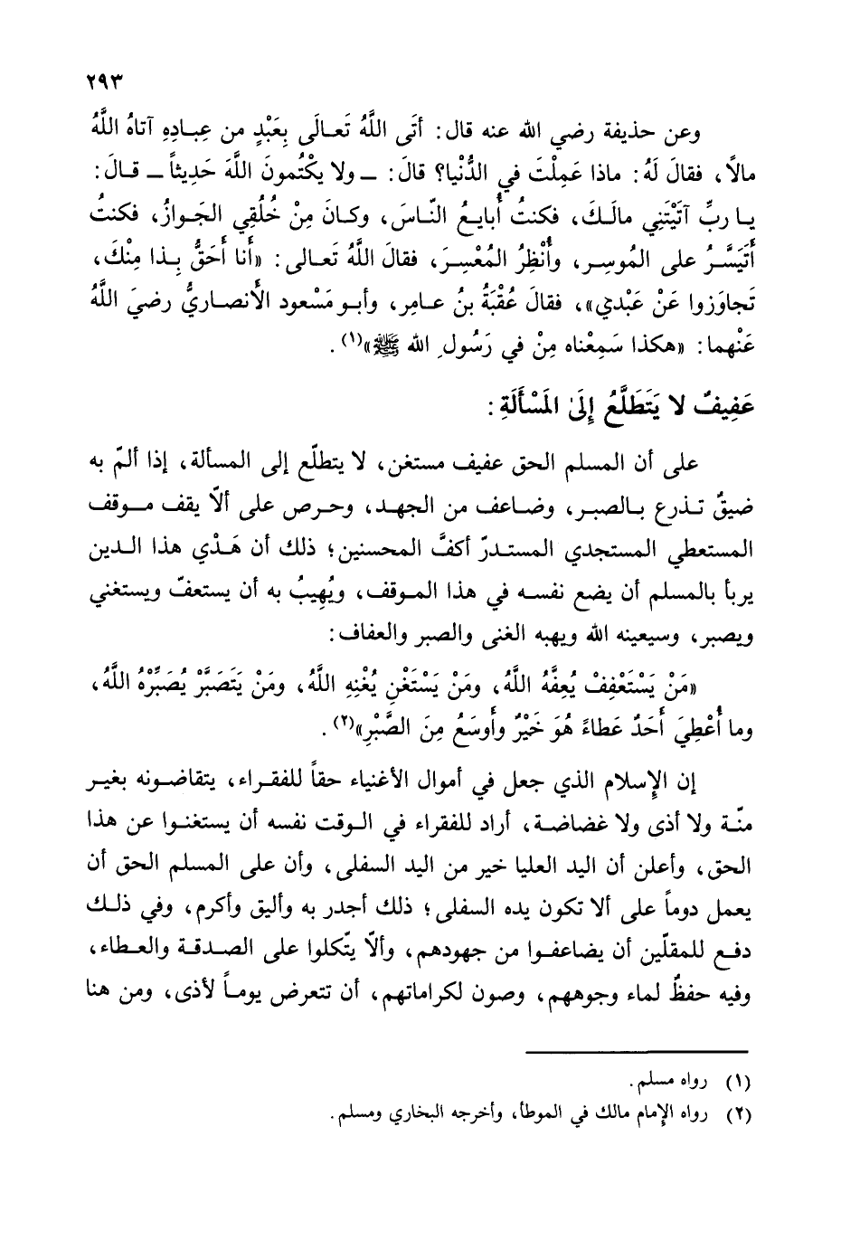 على أن المسلم الحق عفيف مستغن، لا يتطلع إلى المسألة، إذا ألم به