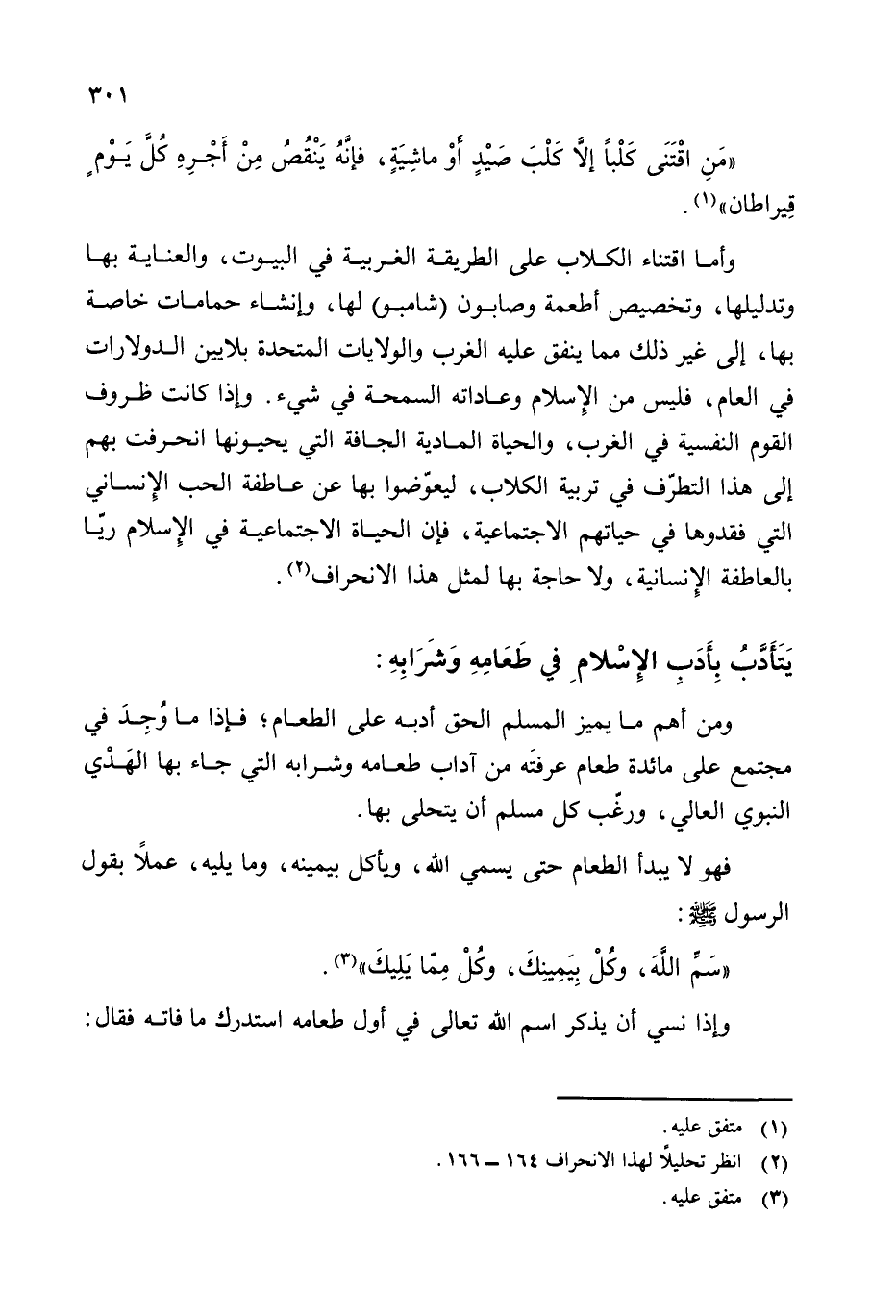وأما اقتناء الكلاب على الطريقة الغربية في البيوت، والعناية بها وتدليلها، وتخصيص أطعمة وصابون (شامبو) لها، وإنشاء حمامات خاصة بها، إلى غير ذلك مما ينفق عليه الغرب والولايات المتحدة بلايين الدولارات في العام، فليس من الإسلام وعاداته السمحة في شيء. وإذا كانت ظروف القوم النفسية في الغرب، والحياة المادية الجافة التي يحيونها انحرفت بهم إلى هذا التطرف في تربية الكلاب، ليعوضوا بها عن عاطفة الحب الإنساني التي فقدوها في حياتهم الاجتماعية، فإن الحياة الاجتماعية في الإسلام ريا بالعاطفة الإنسانية، ولا حاجة بها لمثل هذا الانحراف (¬2).