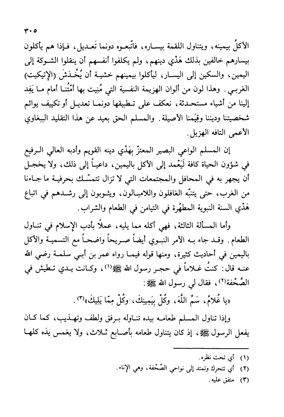 الأكل بيمينه، ويتناول اللقمة بيساره، فاتبعوه دونما تعديل، فإذا هم يأكلون بيسارهم مخالفين بذلك هدي دينهم، ولم يكلفوا أنفسهم أن ينقلوا الشوكة إلى اليمين، والسكين إلى اليسار، ليأكلوا بيمينهم خشية أن يخدش (الإتيكليت) الغربي. وهذا لون من ألوان الهزيمة النفسية التي منيت بها أمتنا أمام ما يفد إلينا من أشياء مستحدثة، نعكف على تطبيقها دونما تعديل أو تكييف يوائم شخصيتنا وديننا وقيمنا الأصيلة. والمسلم الحق بعيد عن هذا التقليد الببغاوي الأعمى التافه الهزيل.