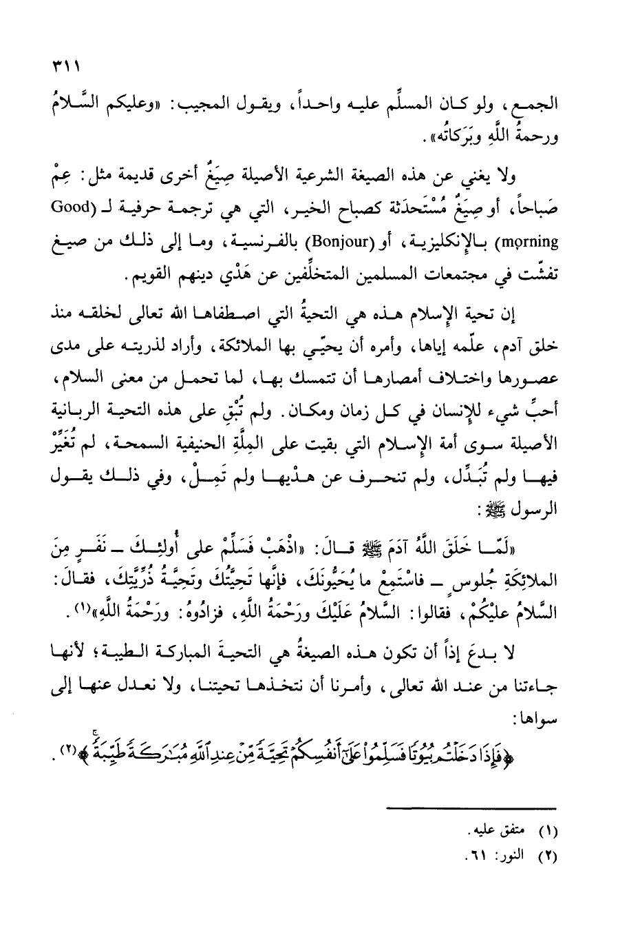 ولا يغني عن هذه الصيغة الشرعية الأصيلة صيغ أخرى قديمة مثل: عم صباحا، أو صيغ مستحدثة كصباح الخير، التي هي ترجمة حرفية لـ ( Good morning) بالإنكليزية، أو ( Bonjour) بالفرنسية، وما إلى ذلك من صيغ تفشت في مجتمعات المسلمين المتخلفين عن هدي دينهم القويم.