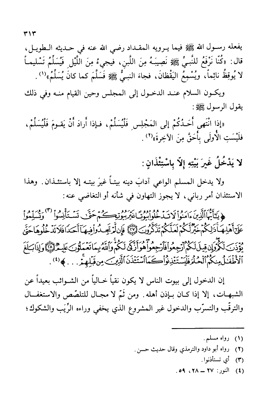 {يَا أَيُّهَا الَّذِينَ آمَنُوا لَا تَدْخُلُوا بُيُوتًا غَيْرَ بُيُوتِكُمْ حَتَّى تَسْتَأْنِسُوا (¬3) وَتُسَلِّمُوا عَلَى أَهْلِهَا ذَلِكُمْ خَيْرٌ لَكُمْ لَعَلَّكُمْ تَذَكَّرُونَ * فَإِنْ لَمْ تَجِدُوا فِيهَا أَحَدًا فَلَا تَدْخُلُوهَا حَتَّى يُؤْذَنَ لَكُمْ وَإِنْ قِيلَ لَكُمُ ارْجِعُوا فَارْجِعُوا هُوَ أَزْكَى لَكُمْ وَاللَّهُ بِمَا تَعْمَلُونَ عَلِيمٌ}.