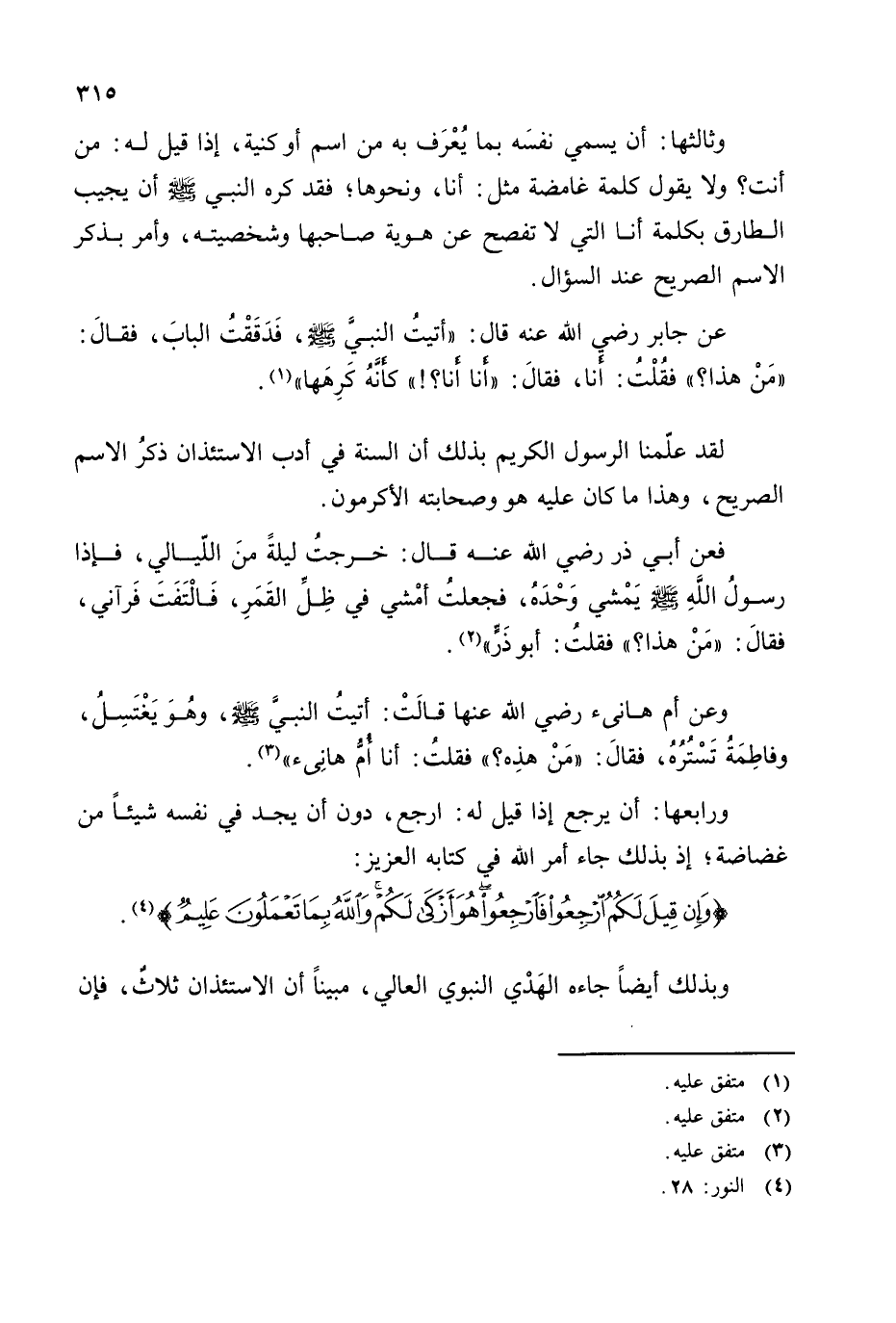 وثالثها: أن يسمي نفسه بما يعرف به من اسم أو كنية، إذا قيل له: من أنت؟ ولا يقول كلمة غامضة مثل: أنا، ونحوها؛ فقد كره النبي - صلى الله عليه وسلم - أن يجيب الطارق بكلمة أنا التي لا تفصح عن هوية صاحبها وشخصيته، وأمر بذكر الاسم الصريح عند السؤال.