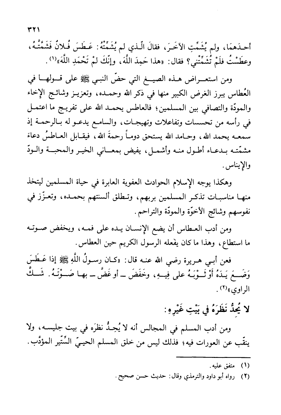 أحدهما، ولم يشمت الآخر، فقال الذي لم يشمته: عطس فلان فشمته، وعطست فلم تشمتني؟ فقال: ((هذا حمد الله، وإنك لم تحمد الله)) (¬1).