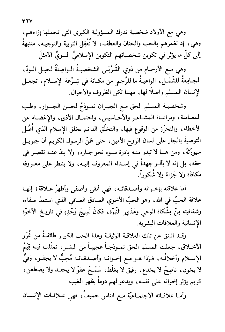 فهو صادق مع الناس جميعا، لا يغش ولا يخدع ولا يغير، ولا يحسد، موف بالعهد، متصف بالحياء، عفو متسامح غفور، طليق الوجه، خفيف الظل، حليم، يجتنب السباب والفحش وبذيء الكلام، لا يرمي أحدا بفسق أو كفر بغير حق، حيي ستير، لا يتدخل فيما لا يعنيه، بعيد عن غيبة الناس والمشي بالنميمة بينهم، يجتنب قول الزور وظن السوء، إذا اؤتمن على سر حفظه ولم يفشه، متواضع لا بتكبر ولا يسخر من أحد، يجل الكبير ويحترم صاحب الفضل، ويعاشر كرام الناس، يحرص على نفع الناس ودفع الضر عنهم، ويسعى للصلح بين المسلمين، يدعو إلى سبيل ربه بالحكمة والموعظة الحسنة، يعود المريض، ويشهد الجنازة، يكافئ على المعروف ويشكر عليه، يخالط الناس ويصبر على أذاهم، يدخل السرور على القلوب ما استطاع إلى ذلك سبيلا، يدل الناس على الخير، يحب التيسير ويجتنب التعسير في الأمور كلها، عادل في حكمه، لا يظلم ولا يحابي ولا ينافق ولا يداهن ولا يرائي، ولا يباهي بأعماله ومنجزاته، مستقيم لا ينحرف ولا يلتوي ولا يتلون مهما تكن الظروف، يحب معالي الأمور ويكره سفسافها، لا يتنطع في كلامه، ولا يصغر خده للناس، كريم جواد، لا يمن على من يعطيهم أو يسدي إليهم معروفا، مضياف، لا يتبرم بالضيف ولا يضيق به ذرعا إن ألم به، يؤثر على نفسه ما استطاع إلى ذلك سبيلا، ينفس عن المعسر، عفيف لا يتطلع إلى المسألة، ويرى اليد العليا خيرا من اليد السفلى، آلف مألوف، يخضع عاداته كلها لمقاييس الإسلام، ويتأدب بأدبه في طعامه وشرابه وسلامه