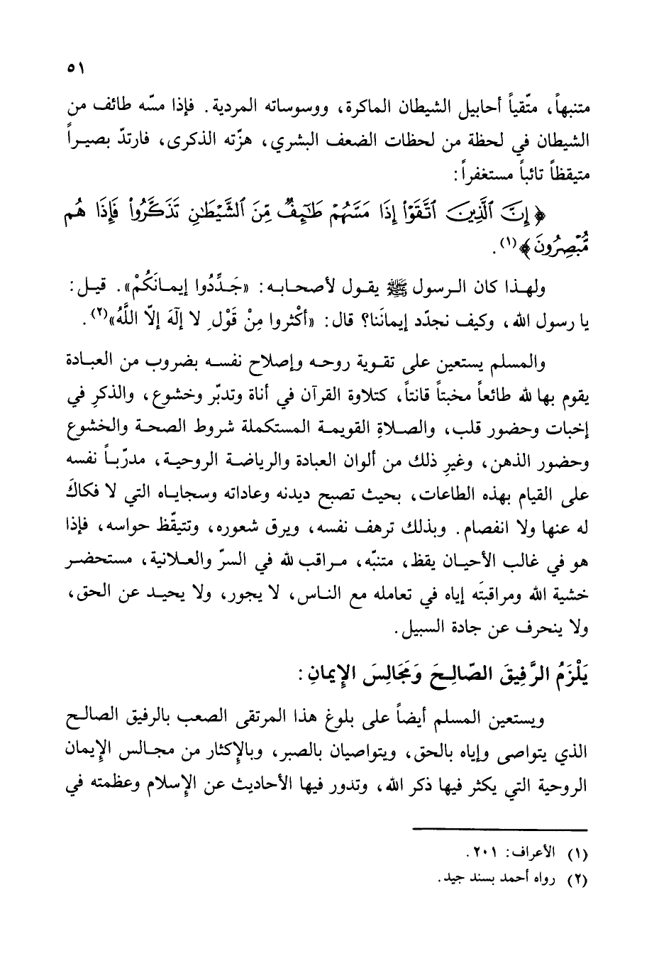 ومن هنا كان لزاما على المسلم أن يعنى بروحه، فيقبل على صقلها بالعبادة والمراقبة لله عز وجل آناء الليل وأطراف النهار، بحيث يبقى يقظا متنبها، متقيا أحابيل الشيطان الماكرة، ووسوساته المردية. فإذا مسه طائف من الشيطان في لحظة من لحظات الضعف البشري، هزته الذكرى، فارتد بصيرا متيقظا تائبا مستغفرا: