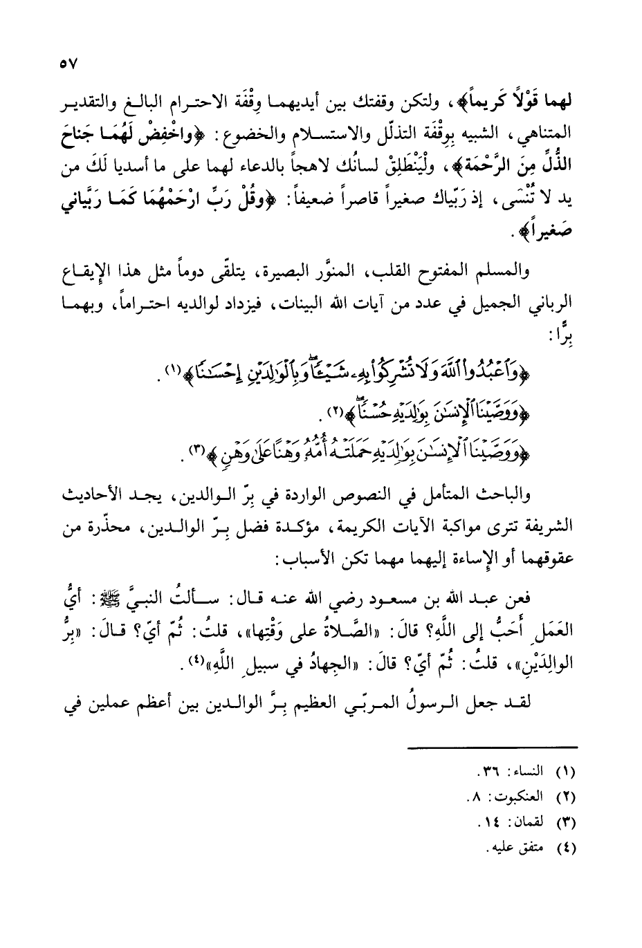 {وَاعْبُدُوا اللَّهَ وَلَا تُشْرِكُوا بِهِ شَيْئًا وَبِالْوَالِدَيْنِ إِحْسَانًا} (¬1).