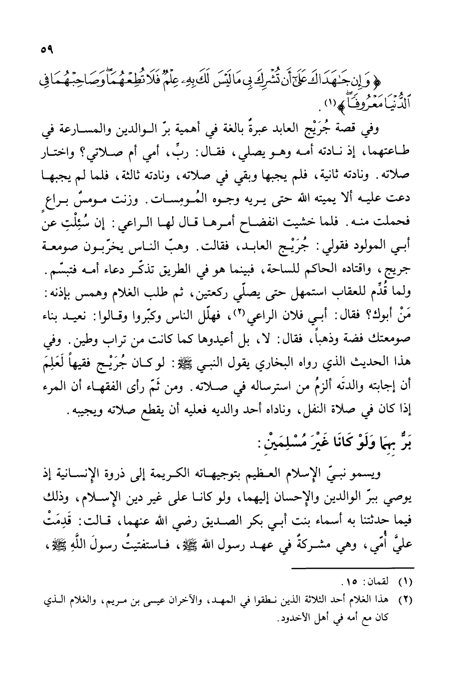 وفي قصة جريج العابد عبرة بالغه في أهمية بر الوالدين والمسارعة في طاعتهما، إذ نادته أمه وهو يصلي، فقال: رب، أير أم صلاتي؟ واختار صلاته. ونادته ثانية، فلم يجبها وبقي في صلاته، ونادته ثالثة، فلما لم يجبها دعت عليه ألا يميته الله حتى يريه وجوه المومسات. وزنت مومس براع فحملت منه. فلما خشيت انفضاح أمرها قال لها الراعي: إن سئلت عن أبي المولود فقولي: جريج العابد، فقالت. وهب الناس يخربون صومعة جريج، واقتاده الحاكم للساحة، فبينما هو في الطريق تذكر دعاء أمه فتبسم. ولما قدم للعقاب استمهل حتى يصلي ركعتين، ثم طلب الغلام وهمس بأذنه: من أبوك؟ فقال: أبي فلان الراعي (¬2)، فهلل الناس وكبروا وقالوا: نعيد بناء صومعتك فضة وذهبا، فقال: لا، بل أعيدوها كما كانت من تراب وطين. وفي هذا الحديث الذي رواه البخاري يقول النبي - صلى الله عليه وسلم -: لو كان جريج فقيها لعلم أن إجابته والدته ألزم من استرساله في صلاته. ومن هنا رأى الفقهاء أن المرء إذا كان في صلاة النفل، وناداه أحد والديه فعليه أن يقطع صلاته ويجيبه.