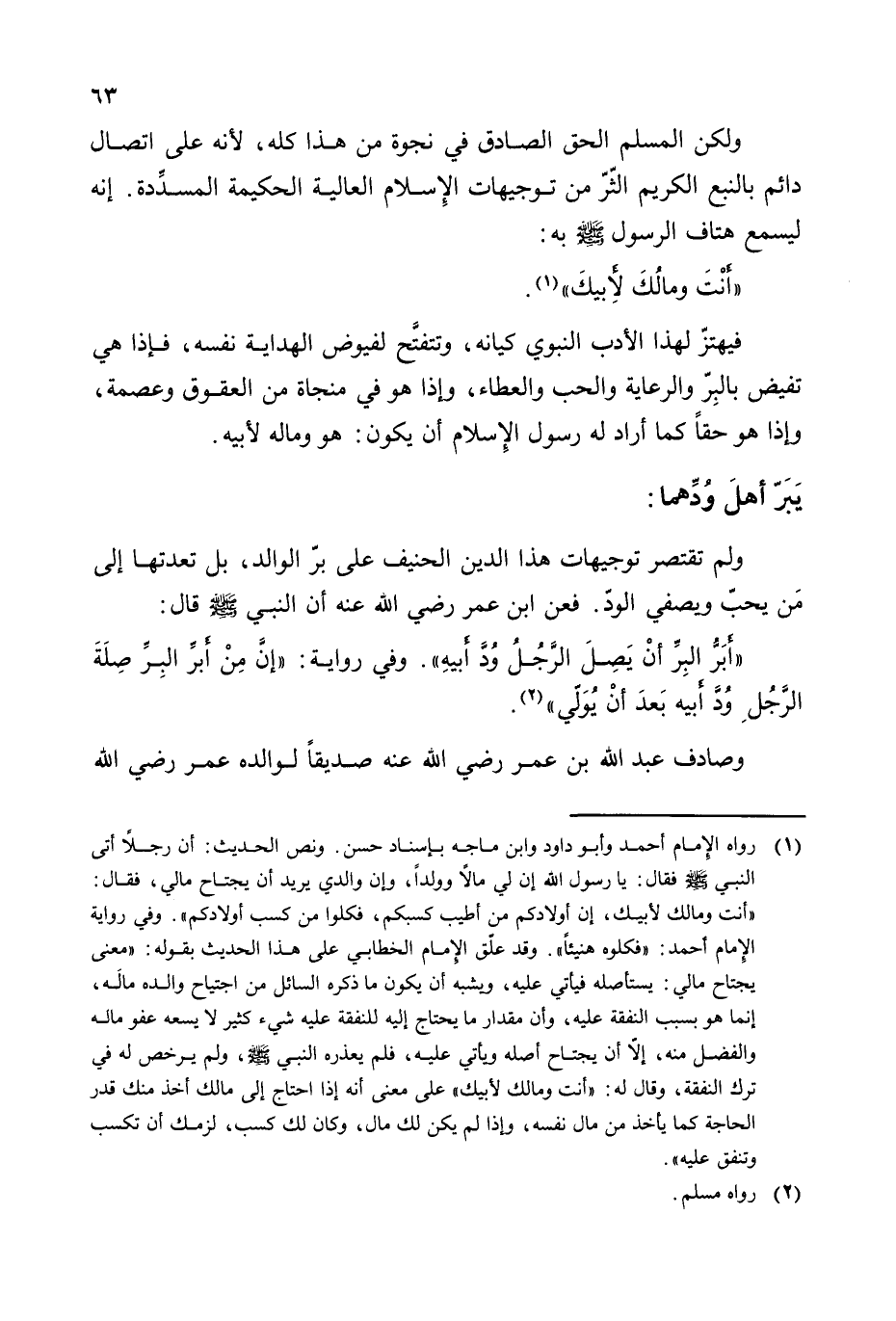 فيهتز لهذا الأدب النبوي كيانه، وتتفتح لفيوض الهداية نفسه، فإذا هي تفيض بالبر والرعاية والحب والعطاء، وإذا هو في منجاة من العقوق وعصمة، وإذا هو حقا كما أراد له رسول الإسلام أن يكون: هو وماله لأبيه.