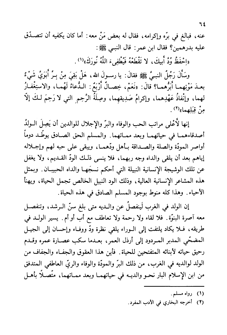 إن الولد في الغرب لينفصل عن والديه متى بلغ سن الرشد، وتنفصل معه آصرة البنوة. فلا لقاء ولا رحمة ولا تعاطف مع أب أو أم. يسير الولد في طريقه، فلا يكاد يلتفت إلى الوراء يلقي نظرة ود ووفاء وإحسان إلى الجيل المضحي المدبر المردود إلى أرذل العمر، بعدما سكب عصارة عمره وقدم رحيق حياته لأبنائه المتفتحين للحياة. فأين هذا العقوق والجفاء والجفاف من الولد لوالديه في الغرب، من ذلك البر والمودة والوفاء والري العاطفي المتدفق من ابن الإسلام البار نحو والديه في حياتهما وبعد مماتهما، متصلا بأهل