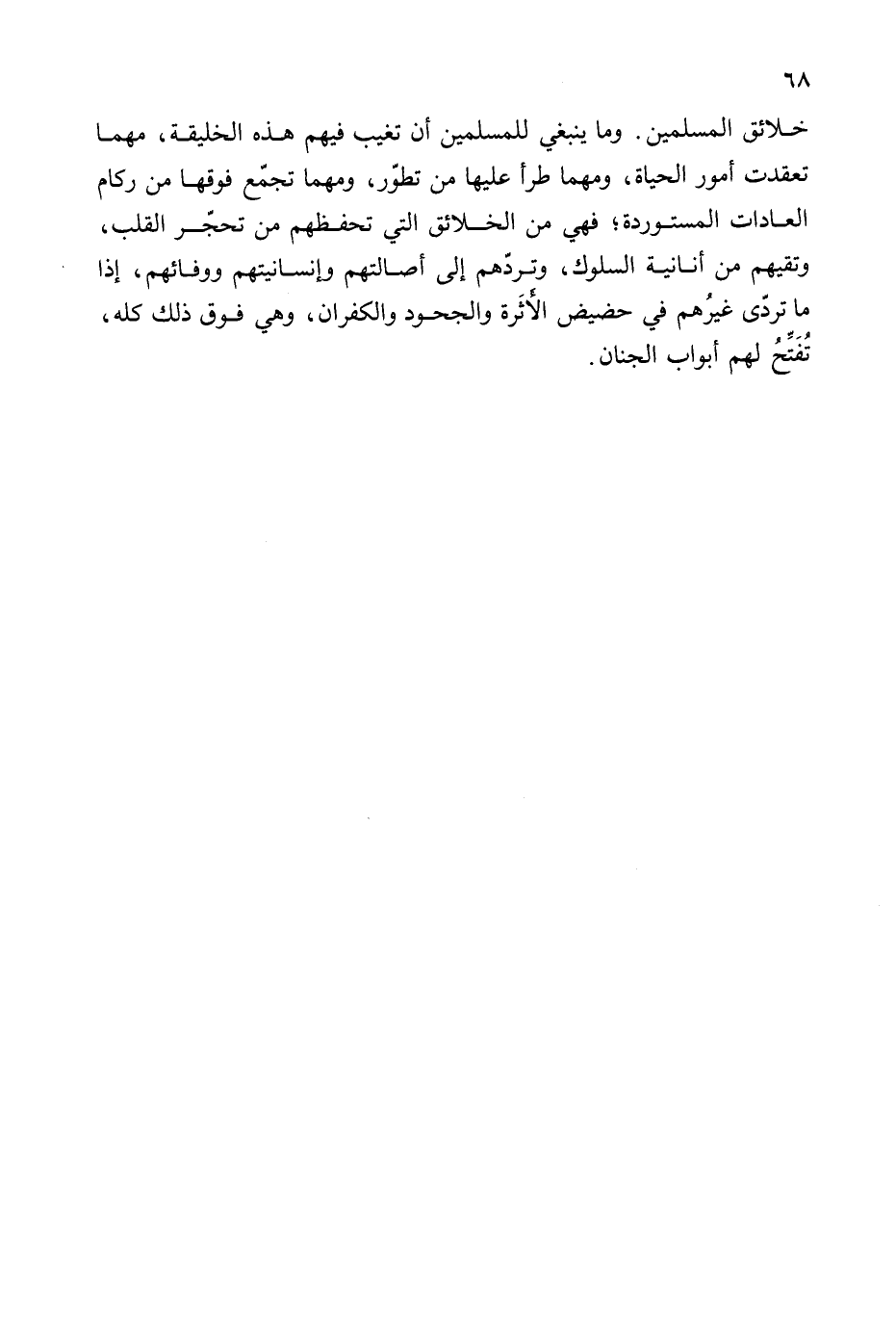 خلائق المسلمين. وما ينبغي للمسلمين أن تغيب فيهم هذه الخليقة، مهما تعقدت أمور الحياة،! مهما طرأ عليها من تطؤر، ومهما تجضغ فوقها من ركام العادات المستوردة؟ فهي من الخلائق التي تحفظهم من تحخر القلب،! تقيهم من أنانية السلوك، وترف! م إلى أصالتهم وإنسانيتهم صوفائهم، إذا ما ترفى غيرهم في حضيض الأثرة والجحود والكفران، وهي فوق ذلك كله، تفتح لهم أبواب الجنان.